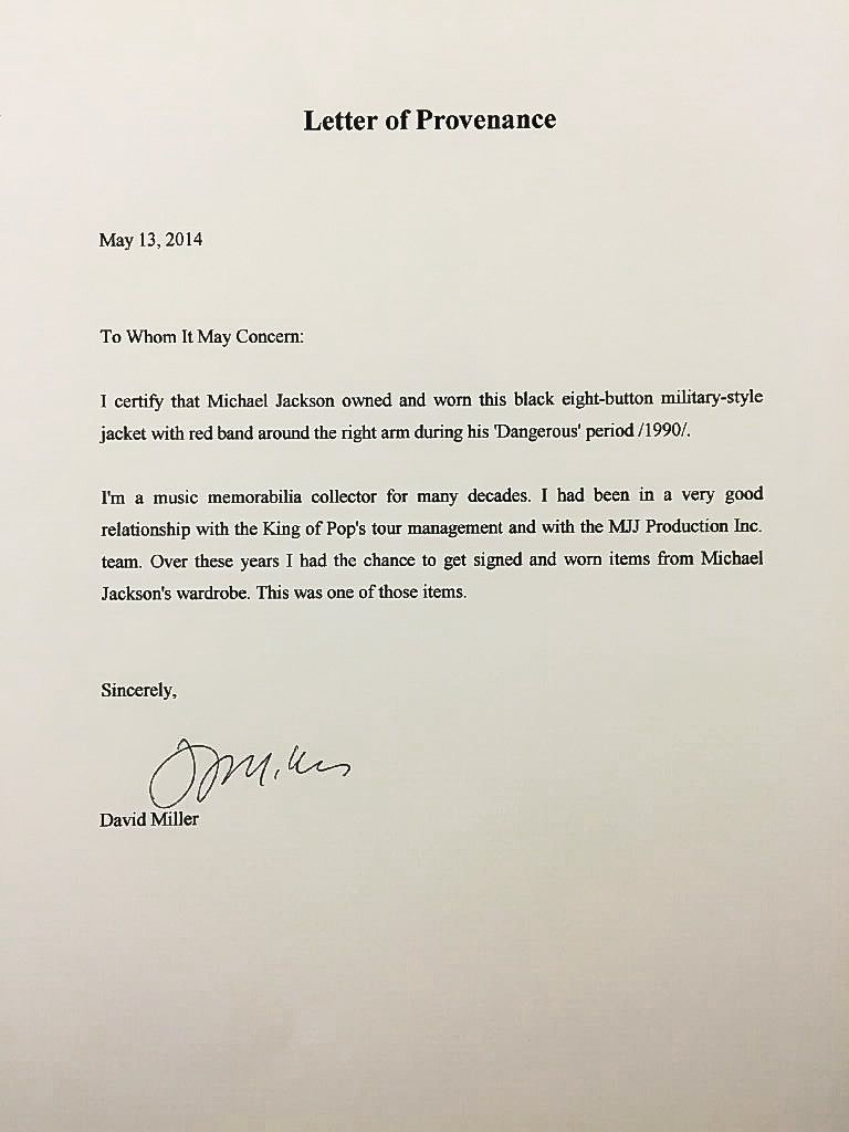 A JACKET OWNED AND WORN BY MICHAEL JACKSON DURING THE DANGEROUS PERIOD. INCLUDES A LETTER OF PROVENANCE.