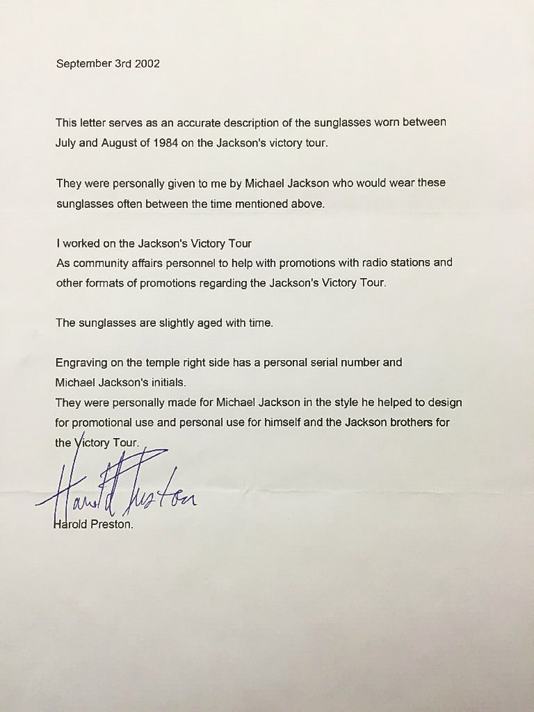 A PAIR OF MICHAEL JACKSON GIFTED PERSONAL VICTORY TOUR WORN SUNGLASSES. THE GLASSES INCLUDE A LETTER FROM HAROLD PRESTON. MR. PRESTON WORKED ON THE JACKSON VICTORY TOUR AS COMMUNITY AFFAIRS PERSONANEL AND WAS GIFTED THE GLASSES DIRECT FROM MICHAEL JACKSON.