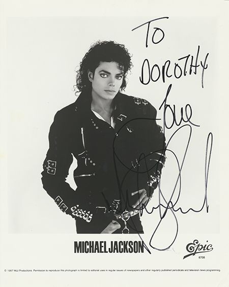 (1958 - 2009) American pop star and actor who started his career with The Jackson 5 and became one of the greatest solo rock singers in history. Died from an overdose of sleeping medication. S.P. 8" x 10" b/w, an Epic Records promotional shot of Jackson in his prime, boldly inscribed and signed. Fine.