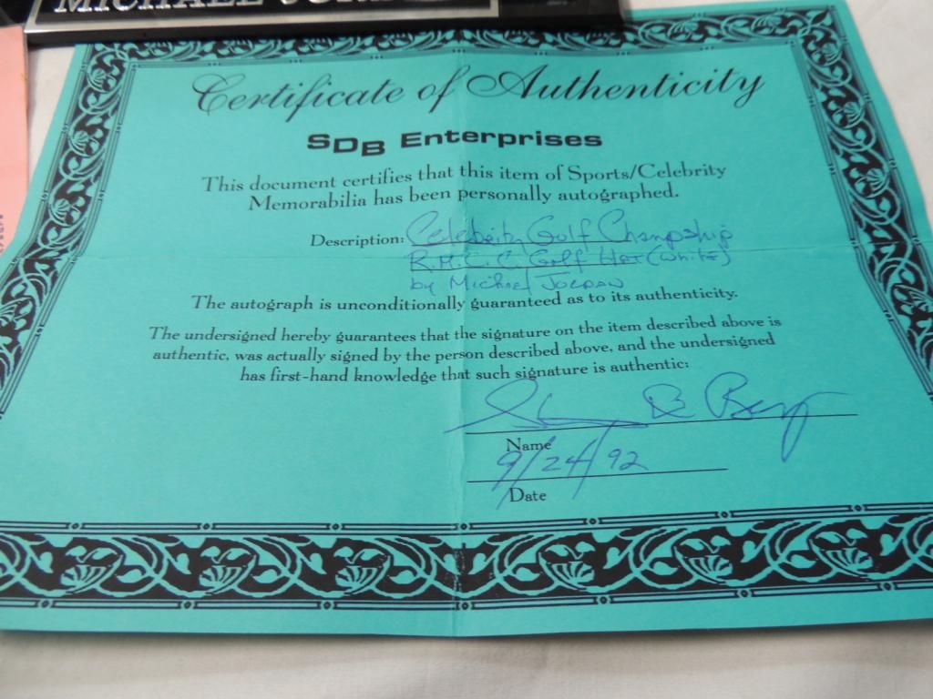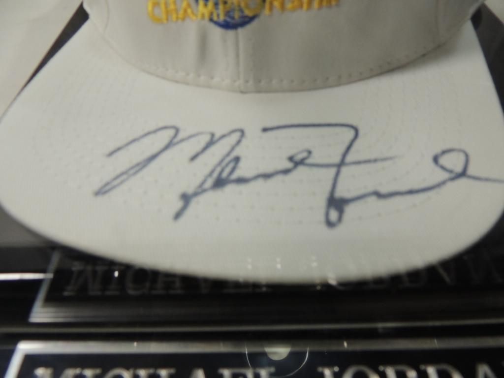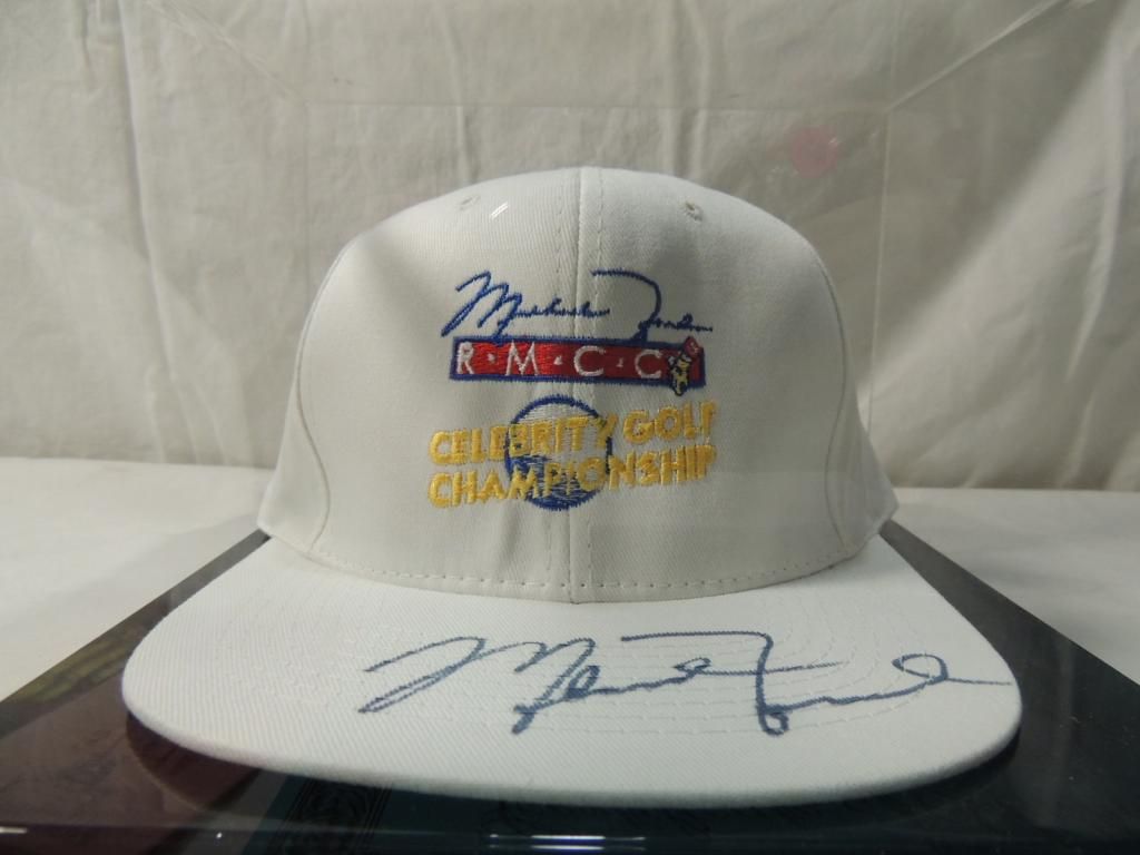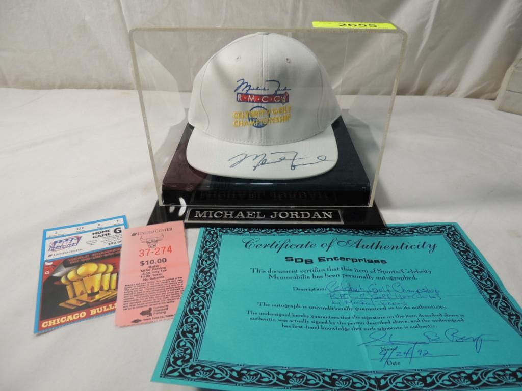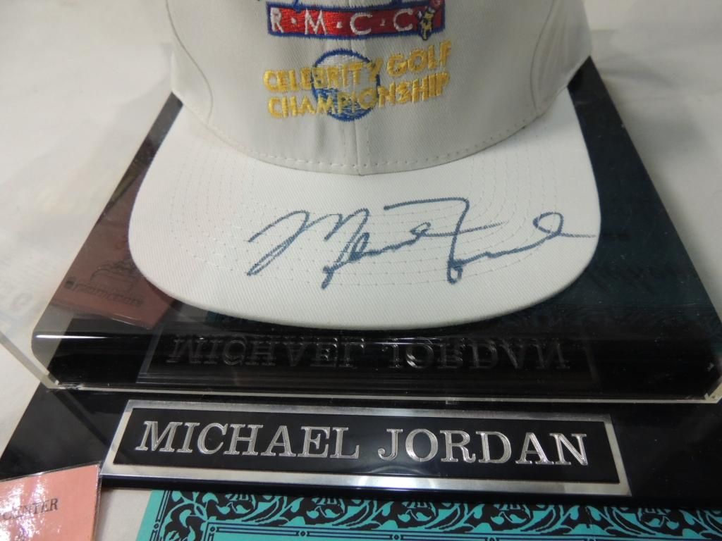 MICHAEL JORDAN AUTOGRAPHED HAT. RMCC CELEBRITY GOLF CHAMPIONSHIP IN DISPLAY CASE. COA INCLUDED. PLAYOFF GAMES TICKET STUB INCLUDED. AS SHOWN SEE PHOTO FOR MORE DETAILS.