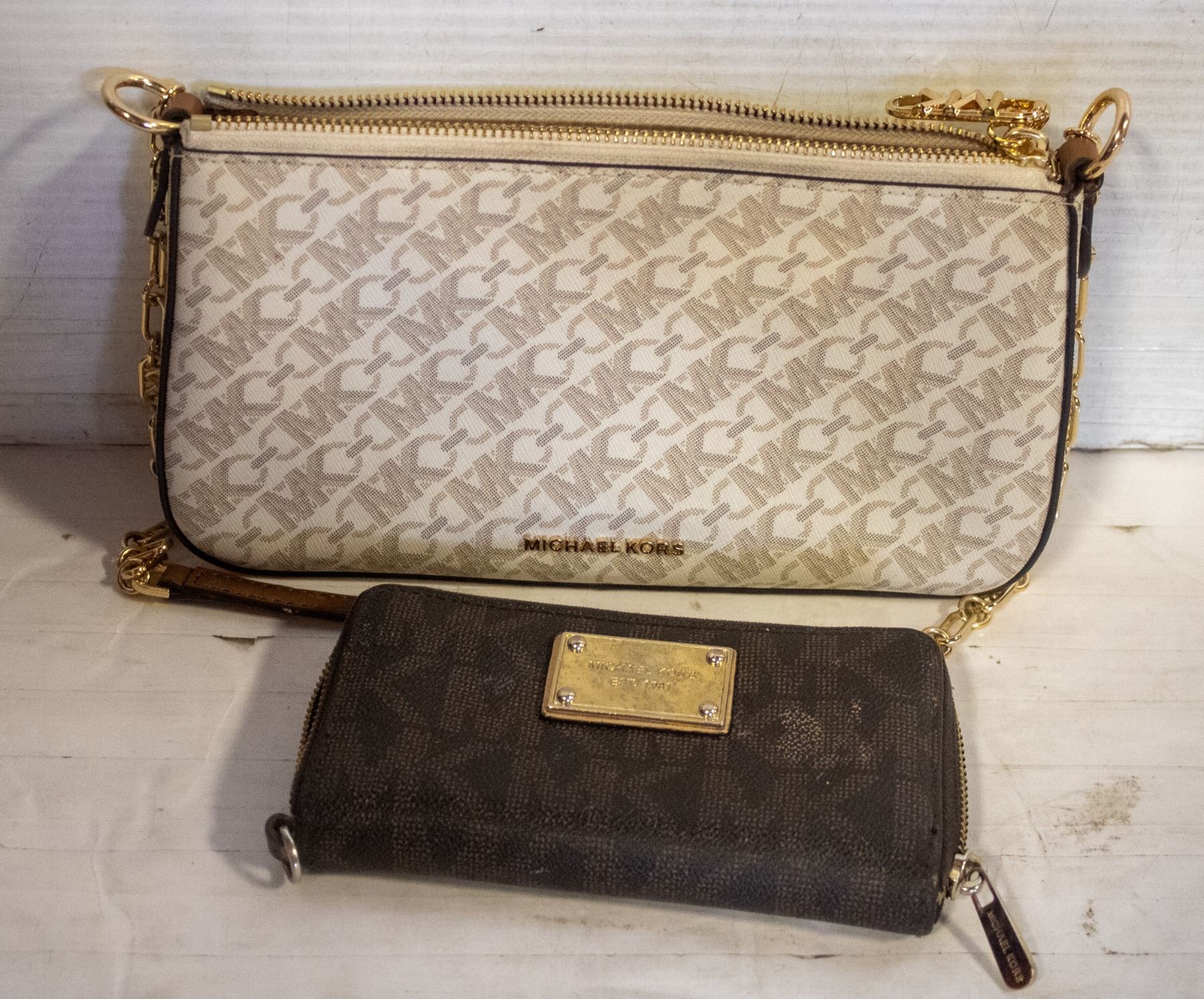 LABELLED MICHAEL KORS OFF WHITE AND GOLD HANDBAG, COFFEE BROWN AND GOLD WALLET (LOT OF 2)