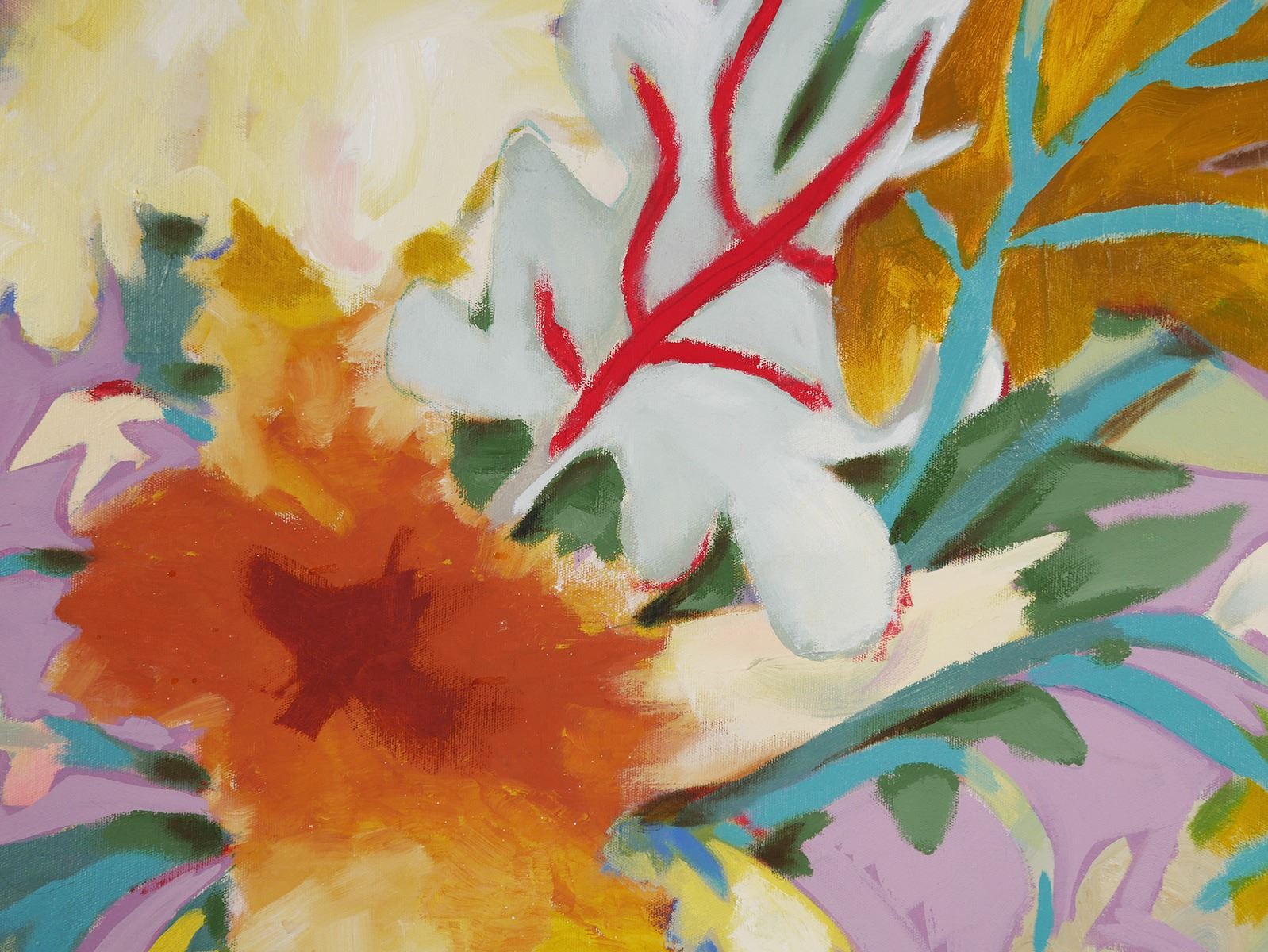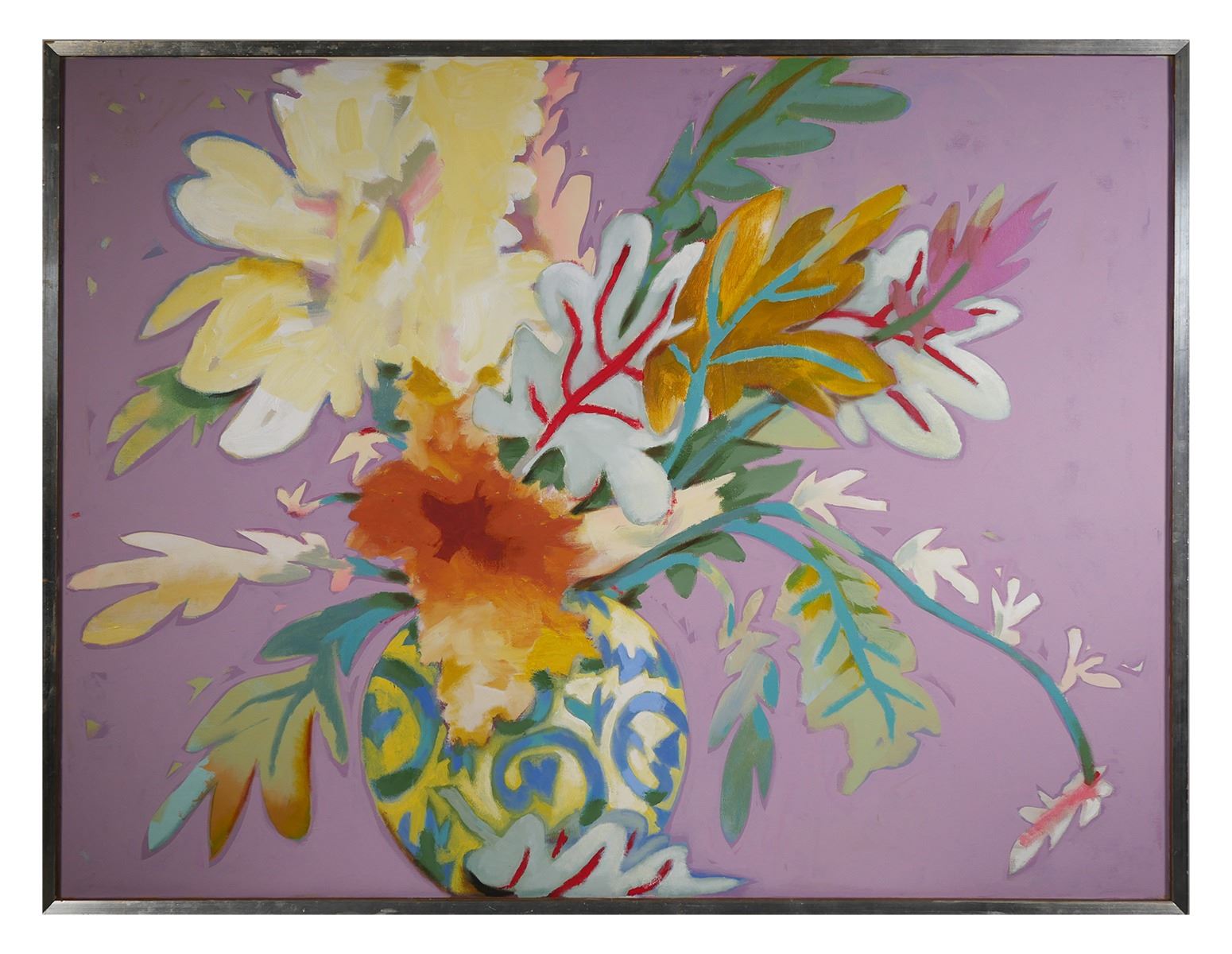 Large oil on canvas painting by renowned artist and fashion designer Michael Vollbracht (American, 1947-2018). Brightly colored floral still life on lavender background. Overall framed size is 55" x 42". Signed at top left. Excellent condition with some wear to the framing. Vollbracht was head designer for Bill Blass from 2003 to 2007 and has designed and illustrated for Geoffrey Beene, Henri Bendel, Bloomingdales and many others. Named a top illustrator by The New Yorker in 1989.