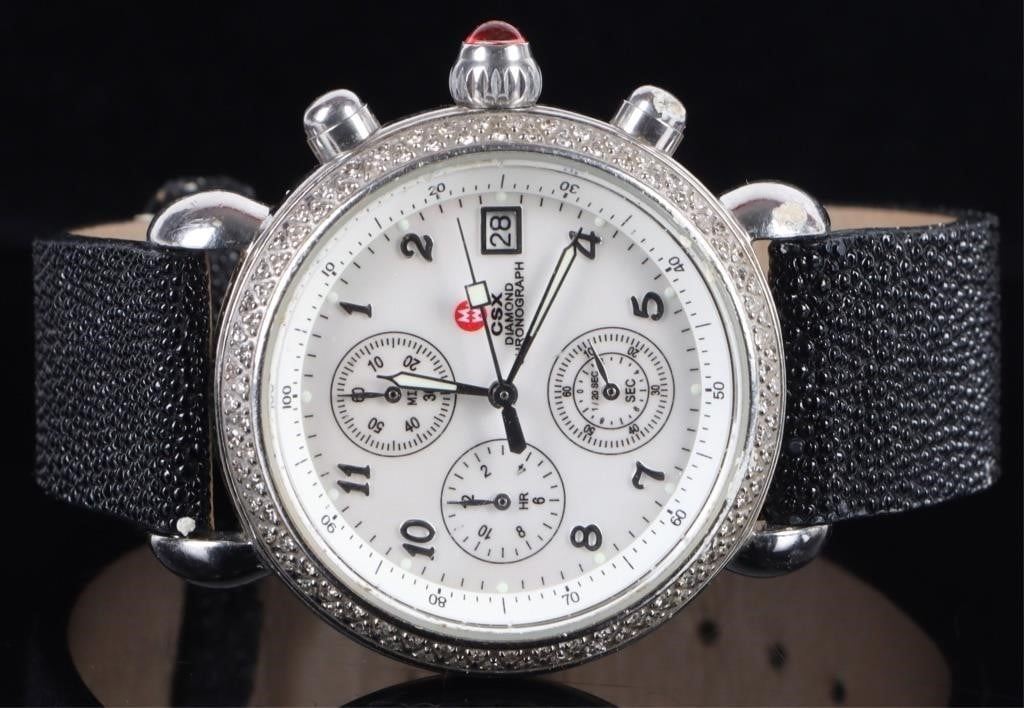 Michele CSX diamond Chronograph mother of pearl ladies wristwatch. comes with original box and papers. Watch is set in a genuine galuchat band. Reference number 71-4000/5000. Michele Ladies