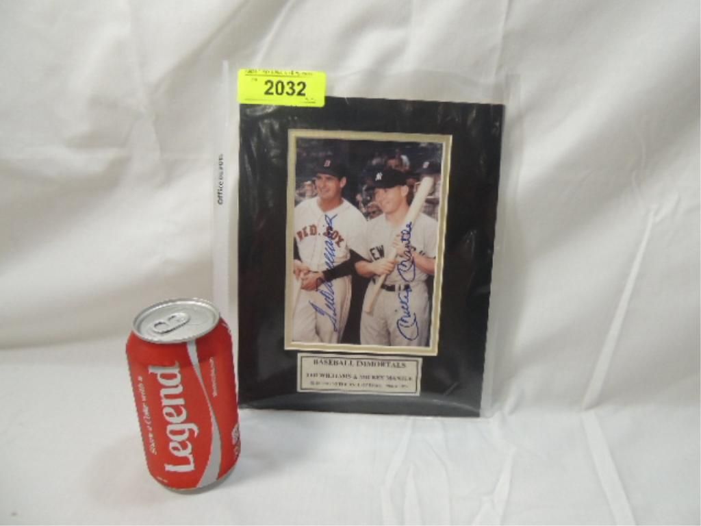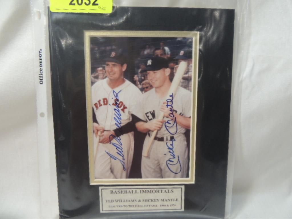 BASEBALL IMMORTALS TED WILLIAMS AND MICKEY MANTLE AUTOGRAPHED MATTED PHOTO. COA BY SCM. AS SHOWN. SEE PHOTO FOR MORE DETAILS. PLEASE BE ADVISED, AND INFORMED REGARDING SIGNATURES OR AUTOGRAPHS THAT WE SELL AT AUCTION: WE ARE NOT AUTHENTICATORS, AND WE DO NOT AUTHENTICATE, OR VALIDATE ANY AUTOGRAPHS OR SIGNATURES THAT WE OFFER AT AUCTION. SOME AUTOGRAPHS OR SIGNATURES MAY COME WITH AN AUTHENTICATION FROM ANY ONE OF LITERALLY HUNDREDS OF AUTHENTICATORS ACROSS THE COUNTRY, AND AROUND THE WORLD. WE DO NOT ENDORSE ANY AUTHENTICATOR, NOR DO WE GUARANTEE THAT ANY AUTOGRAPH OR SIGNATURE IS AUTHENTIC, OR THAT IT WILL PASS AUTHENTICATION BY ANY AUTHENTICATOR. ALL AUTOGRAPHS OR SIGNATURES ARE SOLD
