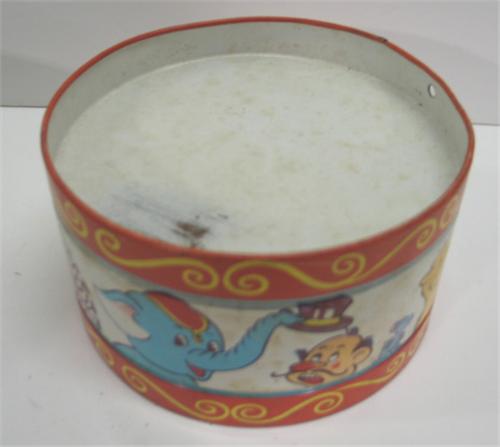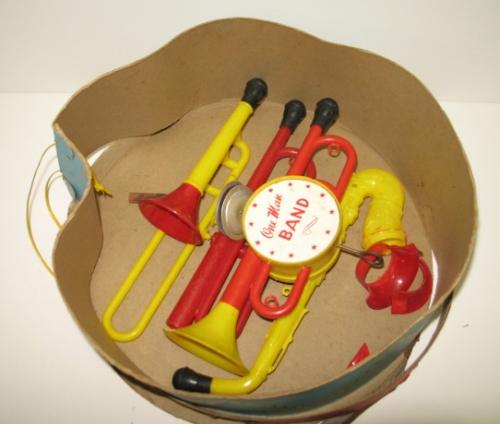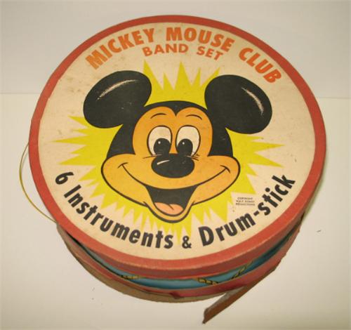 MICKEY MOUSE CLUB BAND SET WITH ORIGINAL BOX. Circular box reads “Mickey Mouse Club Band Set, 6 Instruments and Drum-stick”. Contains plastic trombone, plastic one man band instrument (damage to horn), plastic trumpet (damage to horn), plastic saxophone (damage to horn), & Chein drum. Missing original drum and drum-stick as well as one musical instrument. Box is warped and is damaged. Box measures 11” in Dia.