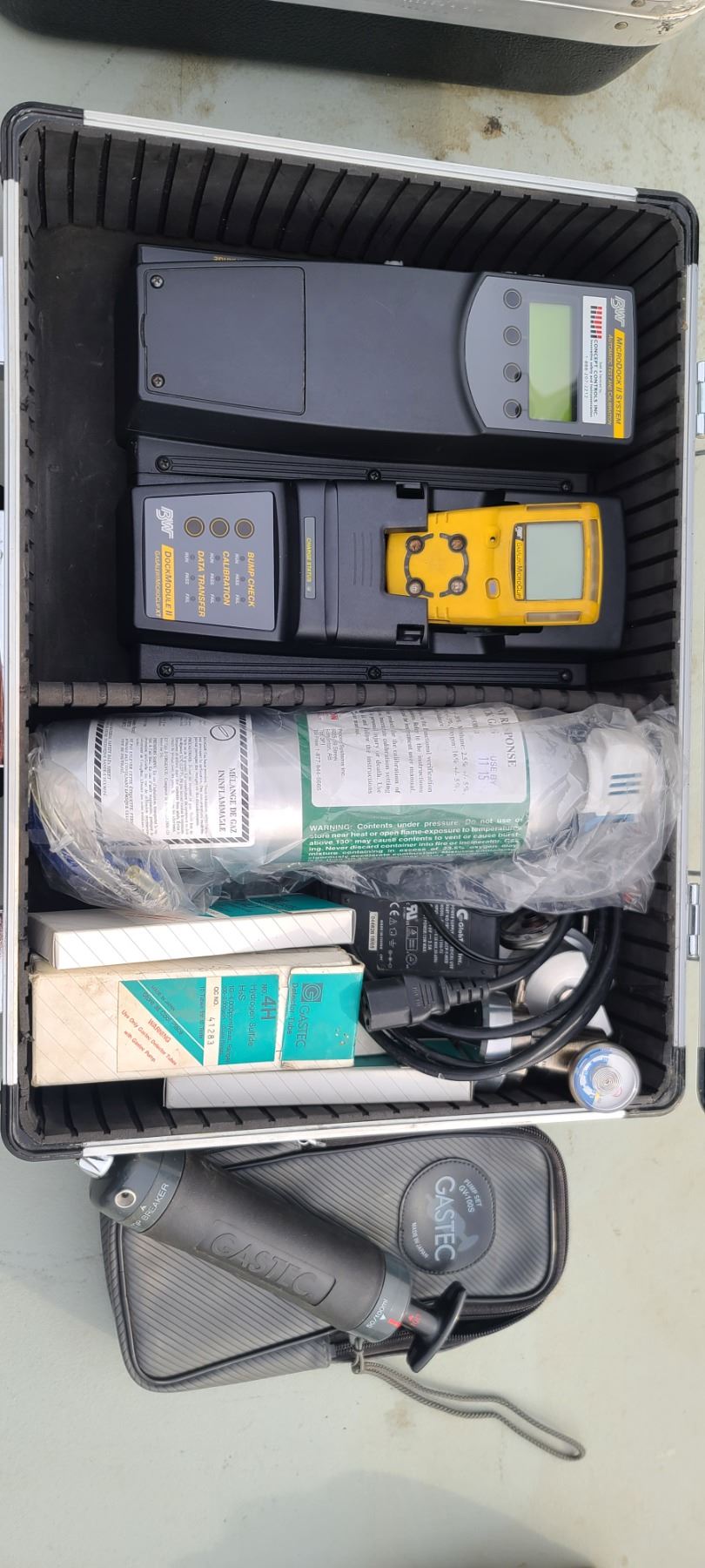MICRO DOCK II SYSTEM AUTOMATIC TEST AND CALIBRATION KIT INCLUDING: BW GAS ALERT MICRO CLIP, GAS TECH PUMP ST GV-100-S, H2S GASTECH DETECTOR TUBES 4LR, 4H, 4LL, 4HM, AND LOCKABLE HARD CASE