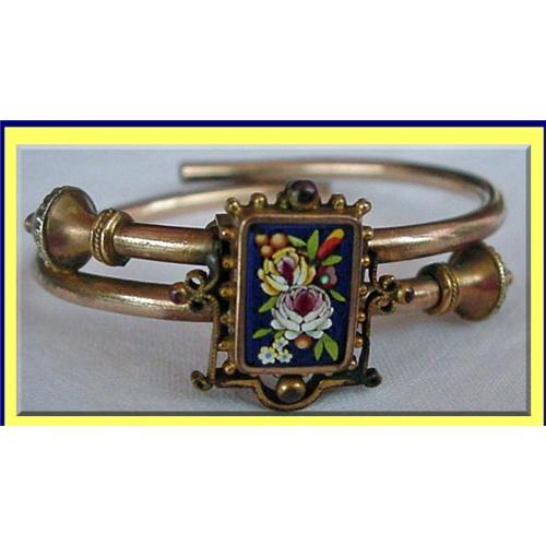 Micromosaic gold filled, Victorian crossover tubular bracelet. Made in 1879.<BR>Beautiful Etruscan Revival Neo classic design. The tubes ending in lantern-shaped finials with tiny beading and gadrooning on the joins. The tubes over the top/center of the bracelet are surrounded by a micromosaic ornament in a beautiful beaded and scrolling frame. Deep blue background with pretty floral and foliate detail. <BR>The back of the micromosaic attachment is engraved Pat. Dec 16 1879.<BR>Very good condition.