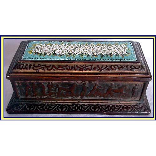 Antique casket box with relief sculpture all around and micromosaic imbedded in the top. Made in France late 19th - early 20th century.<BR>Measures 8inches long. Just under 4 inches wide and a little over 3 1/4inches high.<BR>Handmodelled ceramic with panels of relief sculpted figures and script-like patterns. Some narrow panels have an interlocking scroll and floral theme - somewhat Celtic in taste. The upper panels around the lid look like Persian script. The broad panels on the front and back have an intrigueing theme of humans and horses with chariots. The sides depict somewhat elongated people - again, very curiously arranged, narrow and close to each other. <BR>The top is in total contrast to the earthy clay. Made of tiny micromosaic pieces in turquoise blue, white, yellow, various greens and black. Very finelyconstructed micromosaic of great quality.<BR>Underneath is an impressed mark and the number 613. The mark is almost a circle of scalloped shapes with the words Terre and D'Or fairly clear. The last word is not legible, nor is the mark inside the circle. <BR>Condition is excellent.