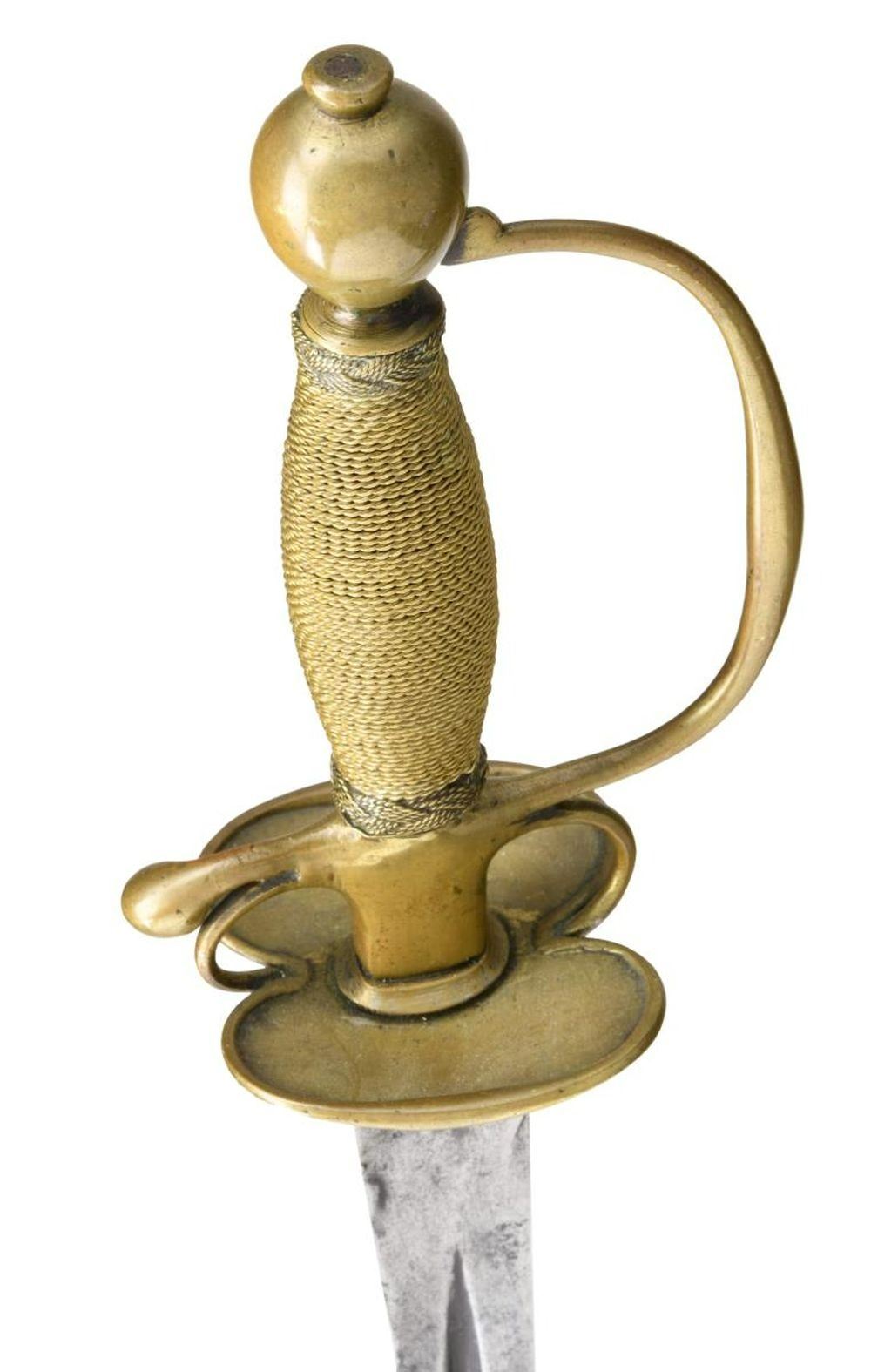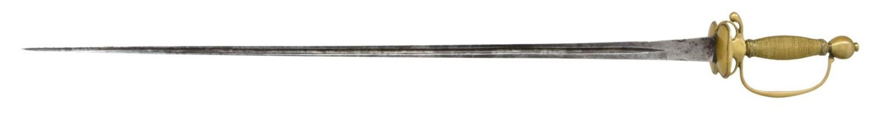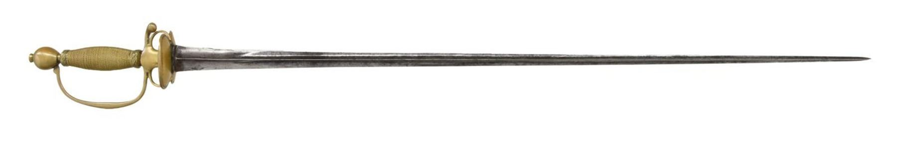 Overall length: 35 1/4". Blade length: 29”. The plain trilobate blade has a single narrow fuller opposite a raised medial ridge. Solid brass hilt with double kidney guard, high pas d’ane, and a drop pendulous quillon. Plain knuckle bow and egg-shaped pommel. Brass wire-wrapped grip with Turk’s head knots above & below. No scabbard. CONDITION: blade has a medium gray patina with spotted discoloration. Entire hilt is quite tight and has a pleasing mustard patina.(02-20087/BF). $600-800.