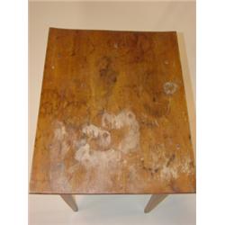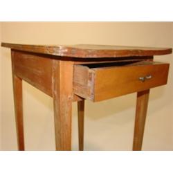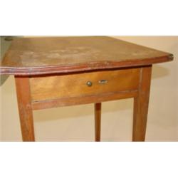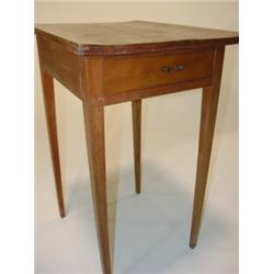 Mid 19th Century New England single drawer stand. Pencil post legs, pegged construction, chamfered top, dovetailed drawer. Top shows staining & scars. Top is also warped. 29" H, 16" x 20"