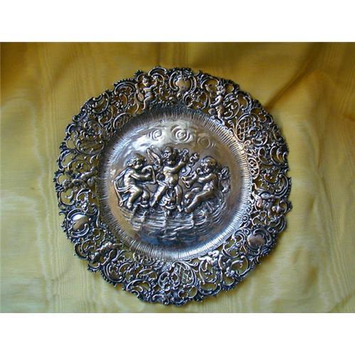 BURTON BROOK FARM ANTIQUES presents a wonderful reticulated repousse' sterling 9 3/4" diameter charger with 9 frolicking PUTTI. The center deep repousse' depicts 3 large putti with horns and harps riding a mythical creature in a cloud swirl. The highly reticulated border has 6 putti with horns and musical instruments . There are 4 tiny maker stamps on the plate center.. w.s.h. in a heart-shape AND tulip / dotted circle and what looks like grapes. This is the most wonderful fantsy plate of exquisite workmanship and very unique if not one-of-a-kind. More images available.
