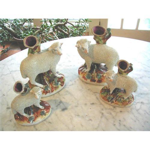 BURTON BROOK FARM ANTIQUES presents a fine set 4 Staffordshire Sheep spill vases / Mid-19th C. / the sheep leaning against a tree trunk with curly vegetables at the base. The sheep coats are "confetti" wool texture . The two adult sheep are on a 5 1/4" base x 7 1/4" tall to top of spill vase ... the two lambs are on a 4 3/8" wide base and are 5 1/8" top of spill vase. The set of four are in excellent condition with very minor flaking of some brown tree trunk enamel on two which we can fix or not. More images available.