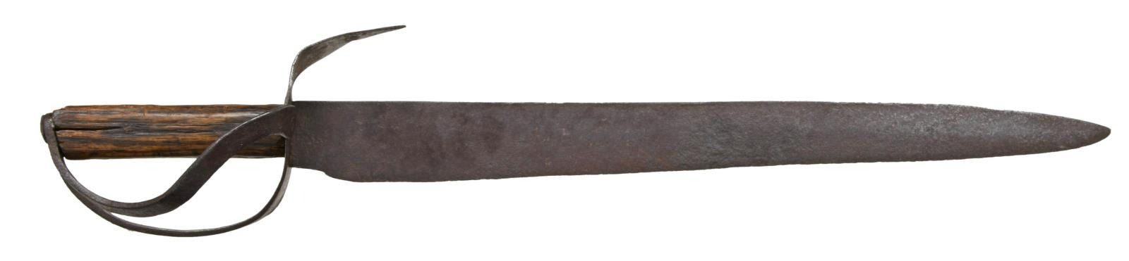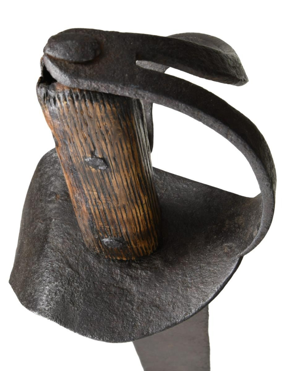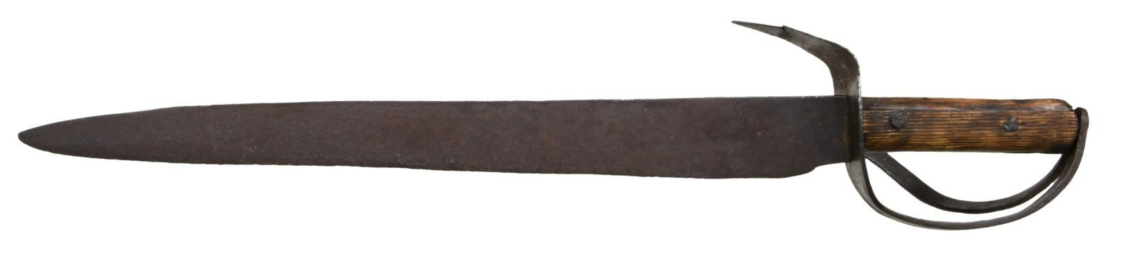 Overall length: 24 1/2". Blade length: 19". This knife, or cutlass, is typical of weapons carried in the American Civil War and are primarily associate with Confederate forces. These arms are generally considered side knives, but this example, because of its large guard and length, could be considered a cutlass. The weapon has a plain iron blade with an iron hilt consisting of a sheet iron guard with a single pinned branch. Both the guard and the branch meet at the pommel that is formed simply by peening the tang. 2-Piece wood grip secured by 2 iron rivets. No sheath. CONDITION: blade has a dark oxidized patina with ample evidence of pitting. The entire hilt has a similar patina. The wood grips are well-worn but substantially complete. PROVENANCE: From the Collection of James B. Taylor. (02-19888/BF). $800-1,200.