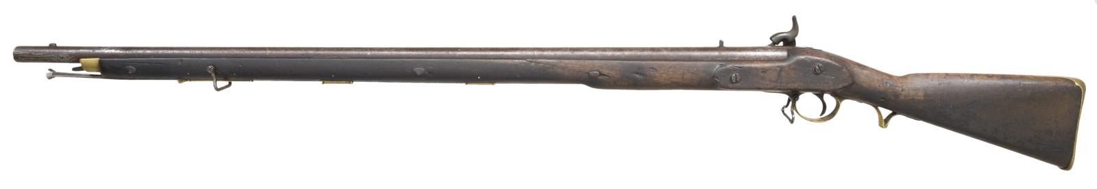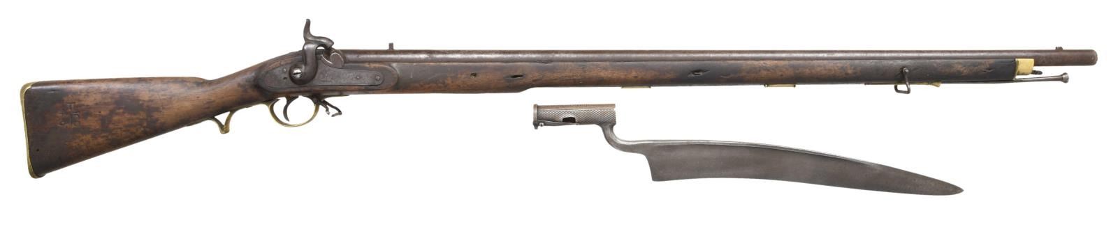 COMPANY MUSKET WITH BAYONET. Cal. 75. NSN. Bbl. 39 1/4". Barrel has a simple front sight that doubles as a bayonet lug. The stationary rear sight is of bridge form. The lock has a British East India Company lion in front of the cock. Heavy brass trigger guard with Nepalese markings & butt plate marked "32 REG". Musket has 3 brass ramrod thimbles & a brass nose cap. The stock has a heavy stamp on the right side which appears to read "F 100 / 40". Iron ramrod. The bayonet is a scarce Kukri shaped bayonet as used by Nepalese state troops. The blade is approx. 17" long and the socket is 4 1/8". The top of the socket has several Sanskrit characters along with the BWI Co. heart symbol. The remainder of the bayonet socket has a crosshatched design. CONDITION: the barrel & lock have a dark, lightly mottled patina. The lock holds both full & half cock. The trigger guard & butt plate, as well as the thimbles & nose cap, have a mellow mustard patina. The stock shows great wear but no significant damage. Fair bore. The bayonet has an overall medium gray patina with light pitting on the blade. (01-23817/BF). $600-900.