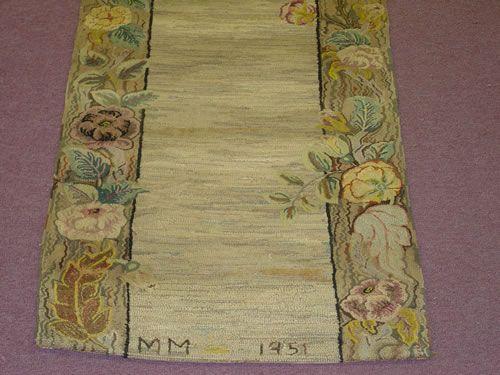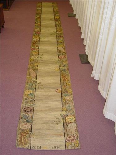 MID 20TH CENT. HOOKED STAIR RUNNER W/ WIDE FLORAL BORDER-STARTED & SIGNED ON ONE END M.M. 1951 & FINISHED & SIGNED ON OTHER END R.S.F. 1955 (21 FT. 4") - WEAR, DIRT STAINS, SEVERAL SMALL HOLES