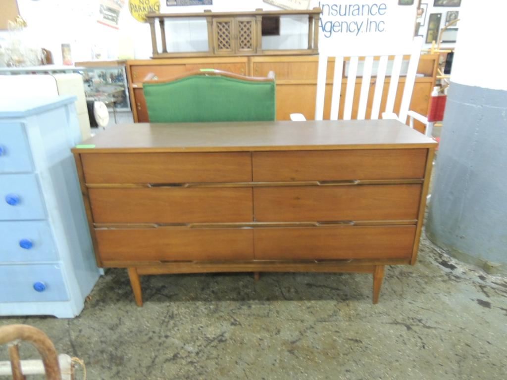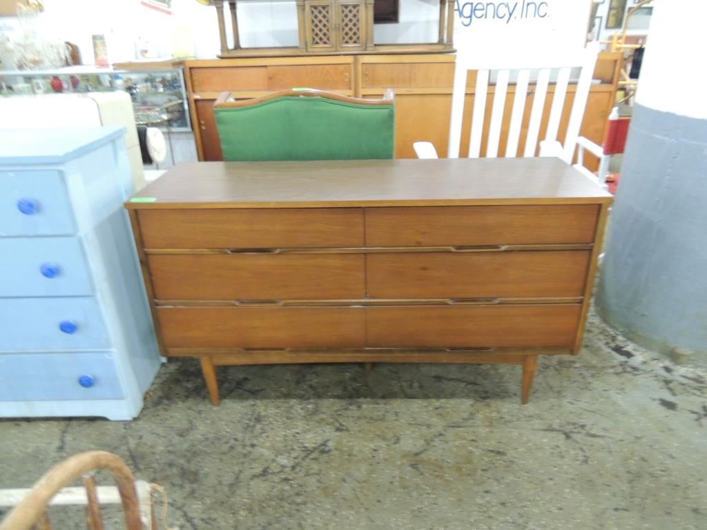MID CENTURY SIX DRAWER DRESSER LONG DRESSER DARK WOOD CLEAN LINE DESIGN AS SHOWN SEE PHOTO FOR MORE DETAILS