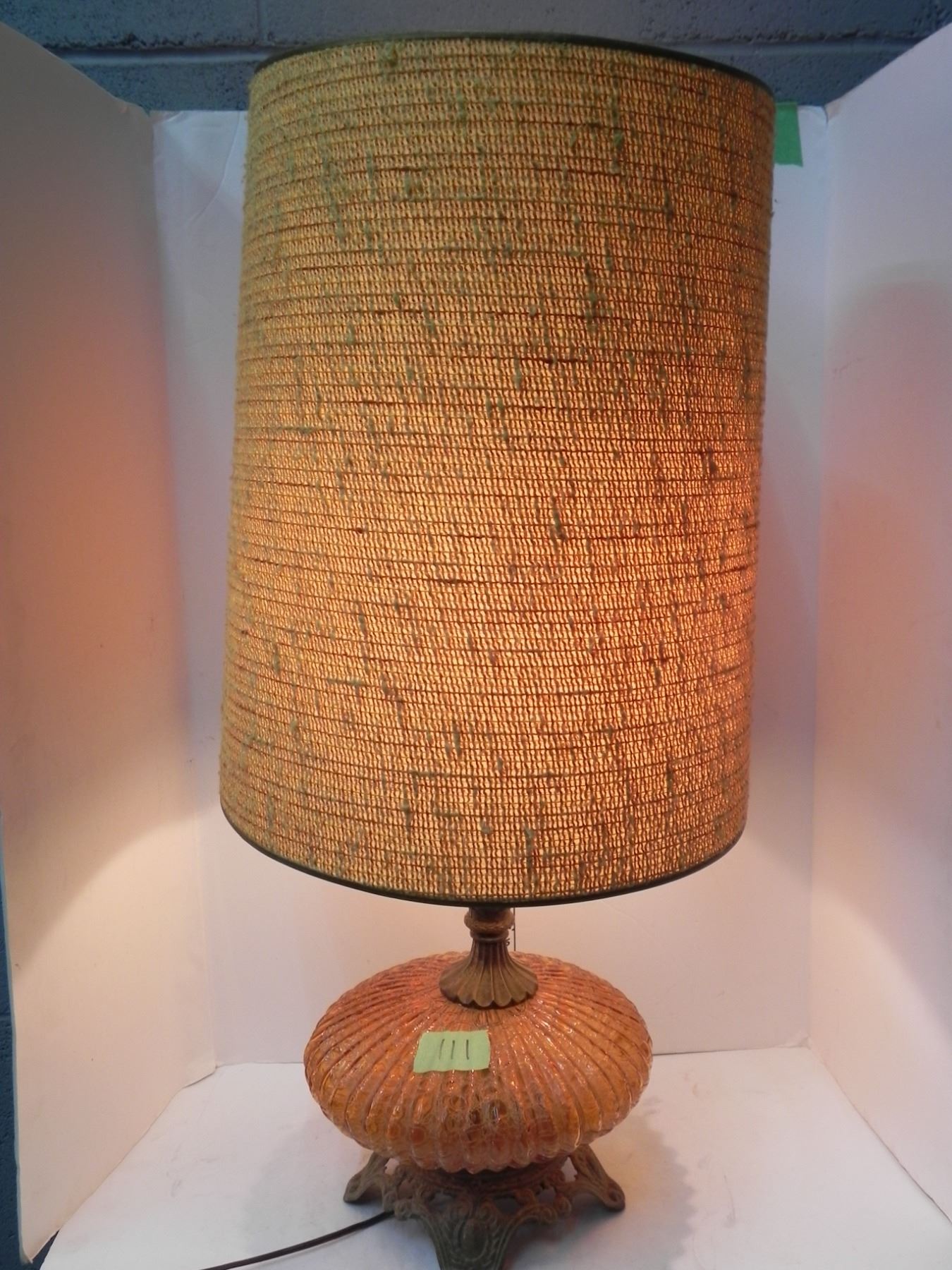 MID CENTURY AMBER CRACKLE GLASS LAMP WITH TALL SHADE. LAMP MEASURES 34" HIGH, LAMP MEASURES 12" IN DIAMETER