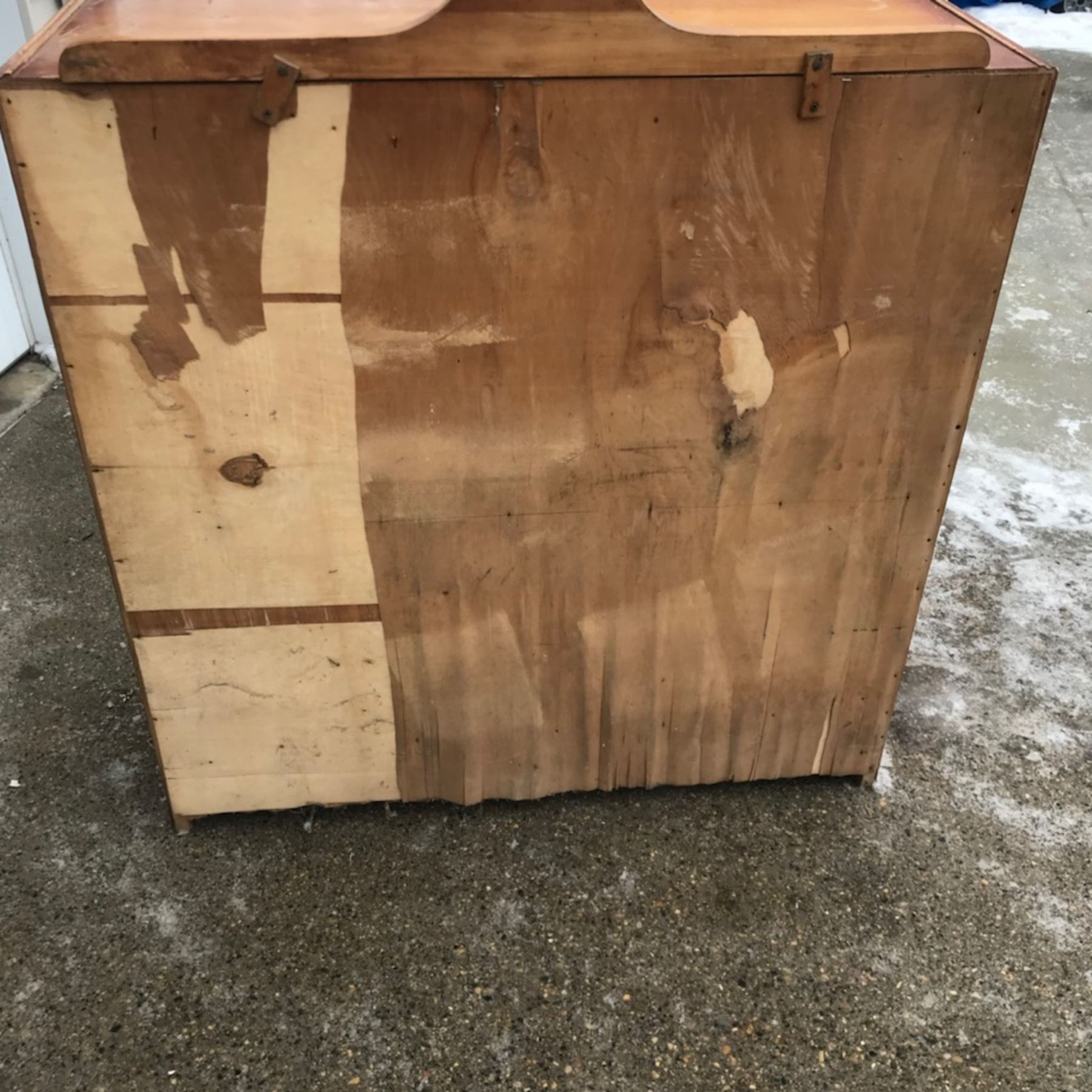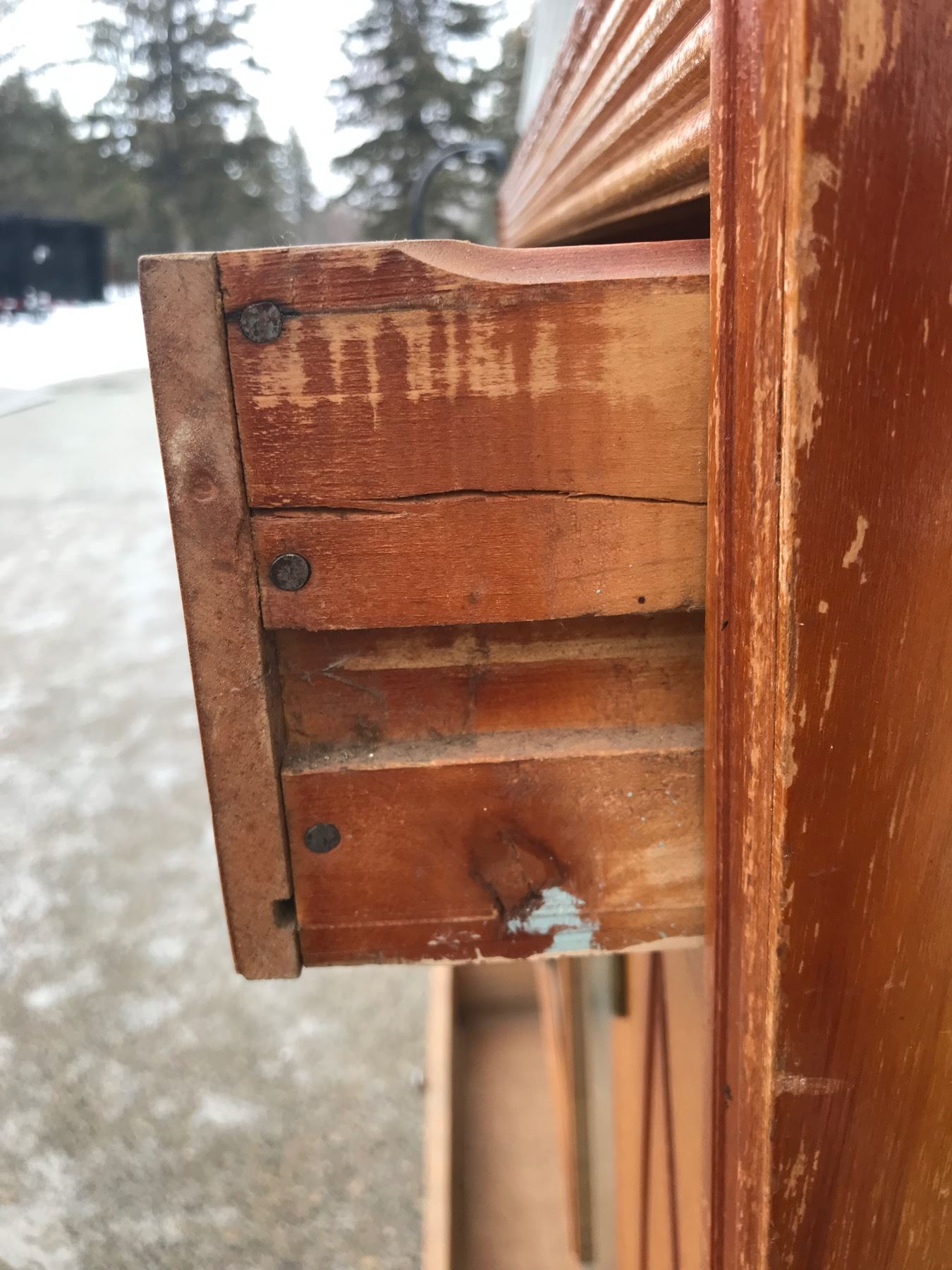 ONLY HAS GLASS ON ONE SIDE, BUT HAS GOOD "BONES” FOR A RE-DO. FRAME IS WOOD. IT IS STURDY. NEEDS A REFINISH OR A REPAINT.