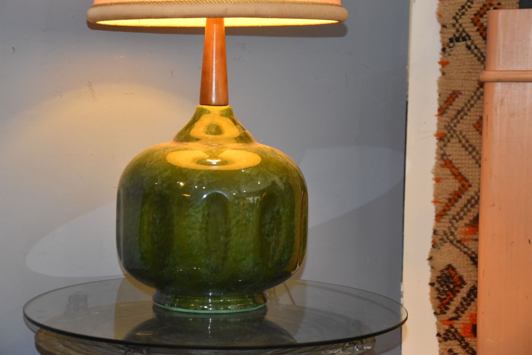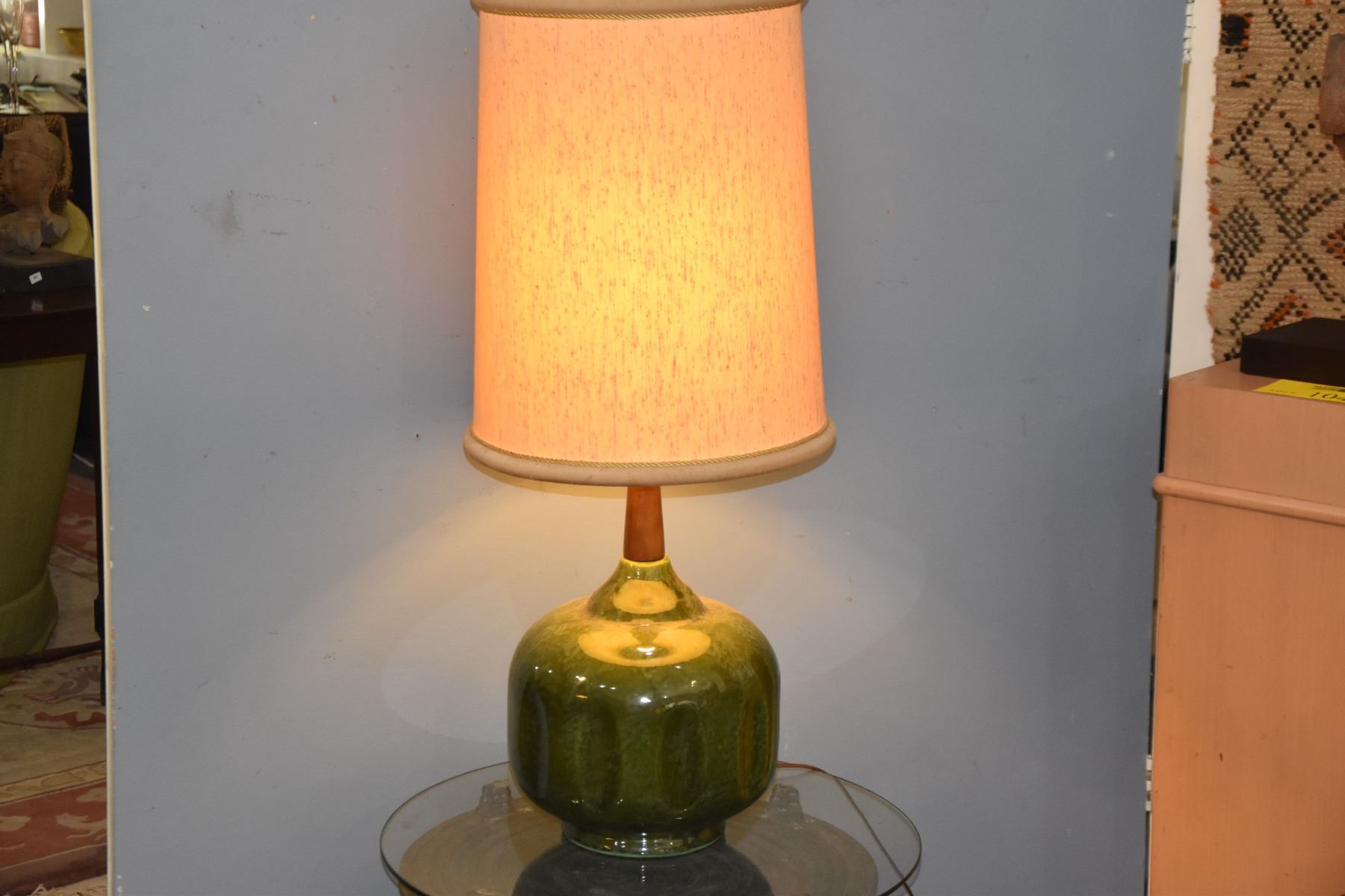 MID CENTURY GREEN CERAMIC TABLE LAMP W/SHADE