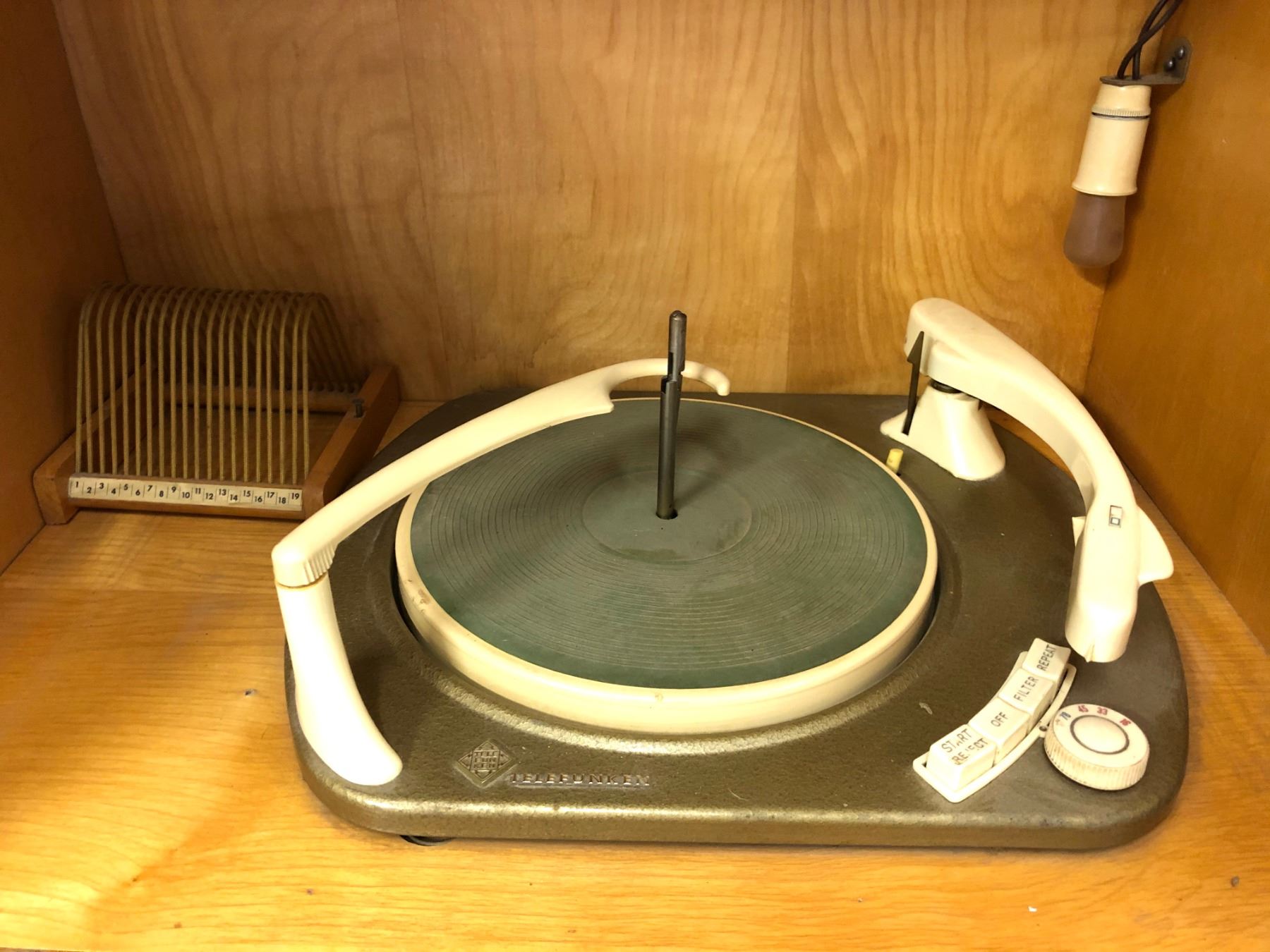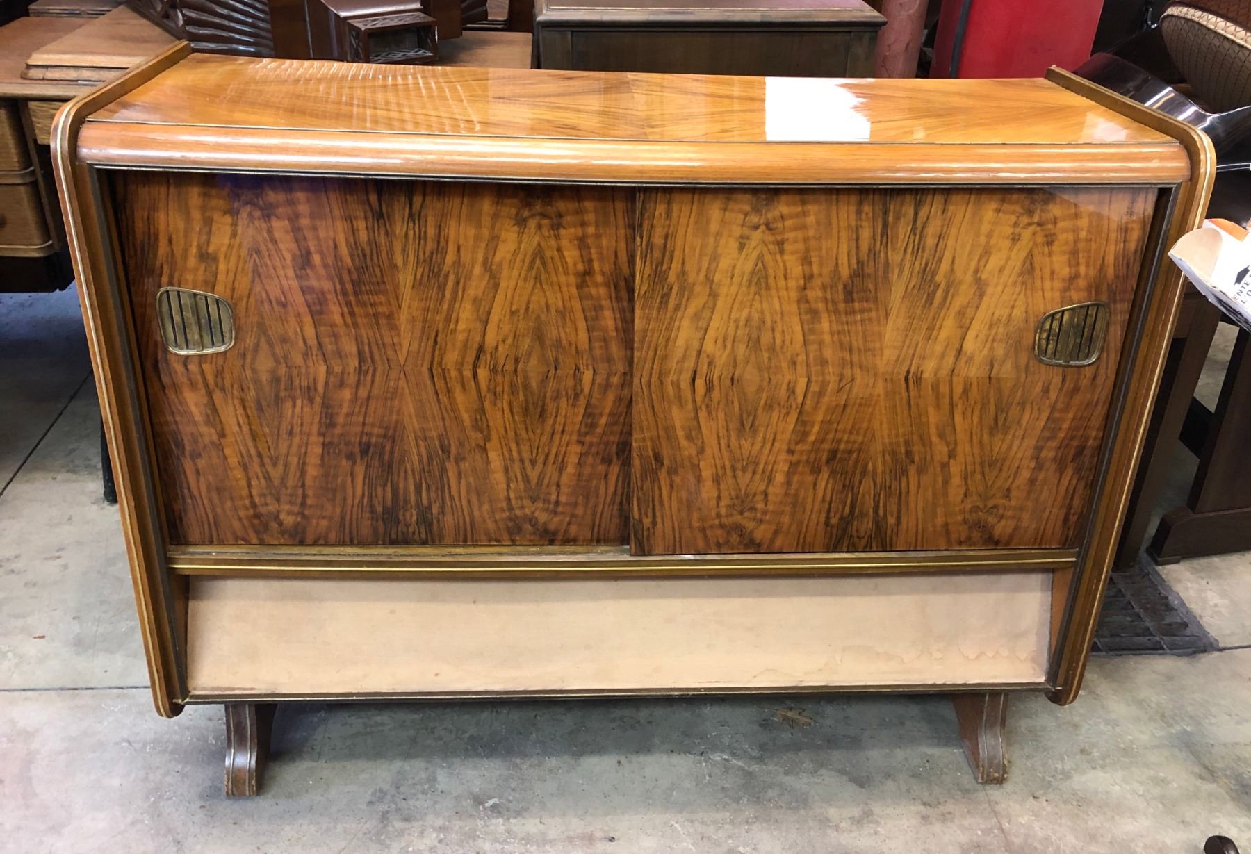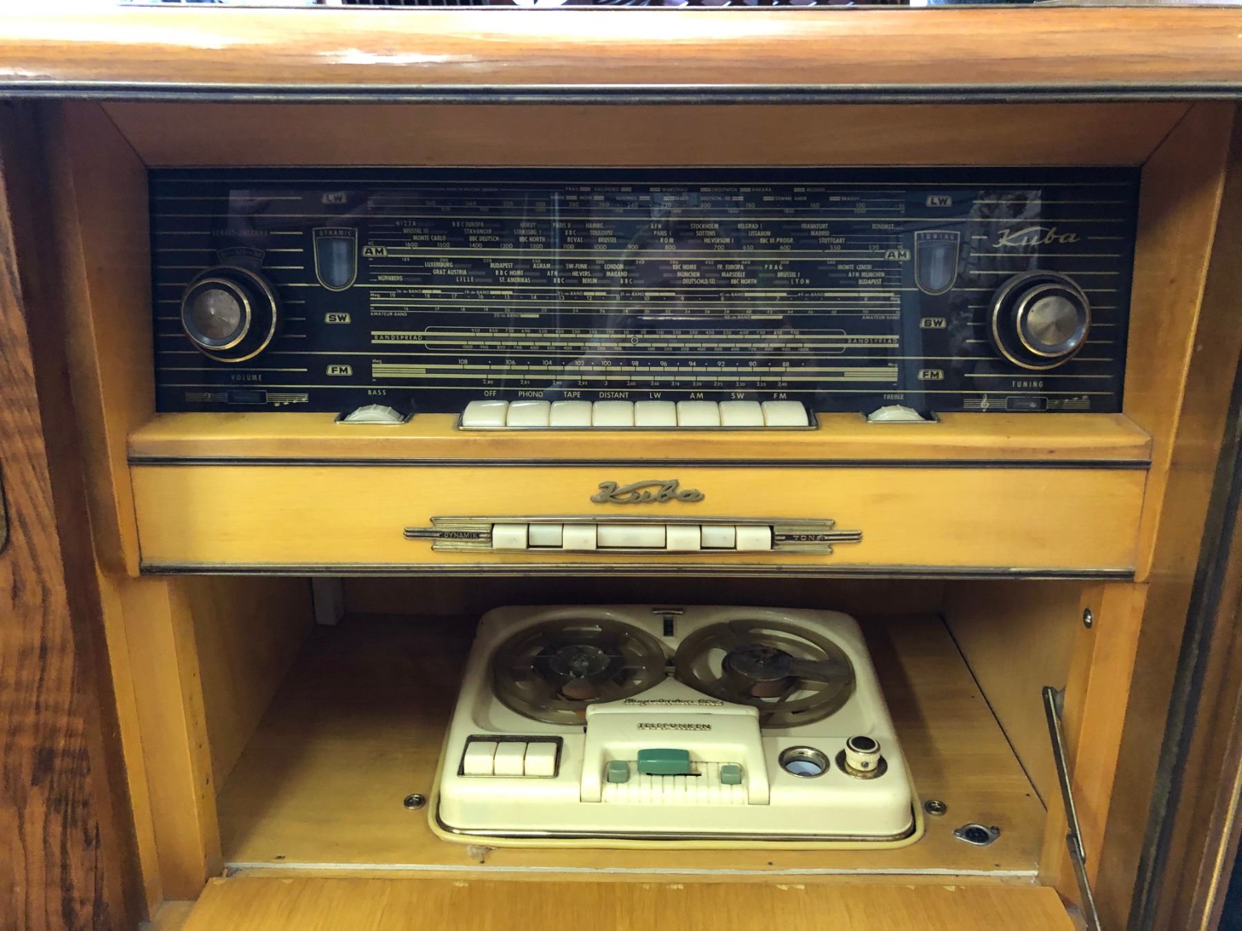 NOTE: INCLUDES RADIO, REEL TO REEL, TURNTABLE & RECORD HOLDER. VENEER IN GOOD CONDITION.