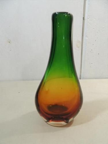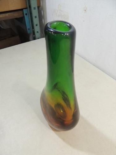 MID-CENTURY MODERN ART GREEN & AMBER GLASS DECORATIVE VASE. 12"H. NO MAKER MARKS. AS SHOWN. VIEW PICTURE FOR DETAIL.