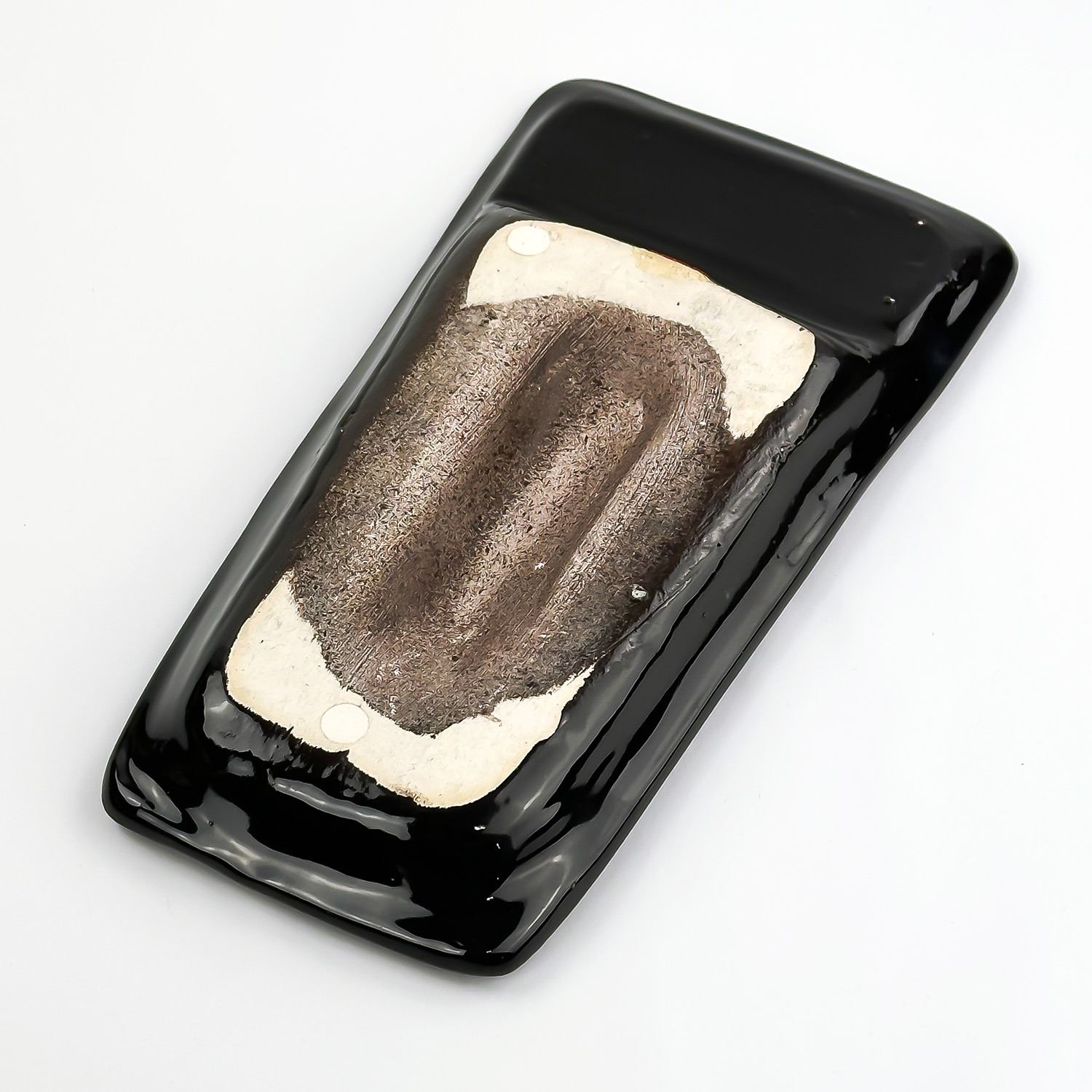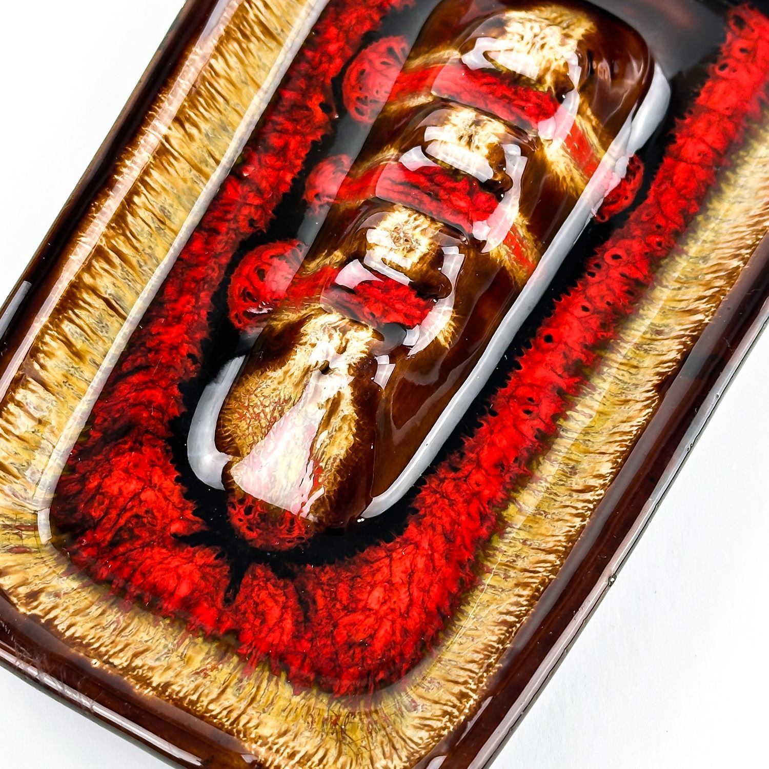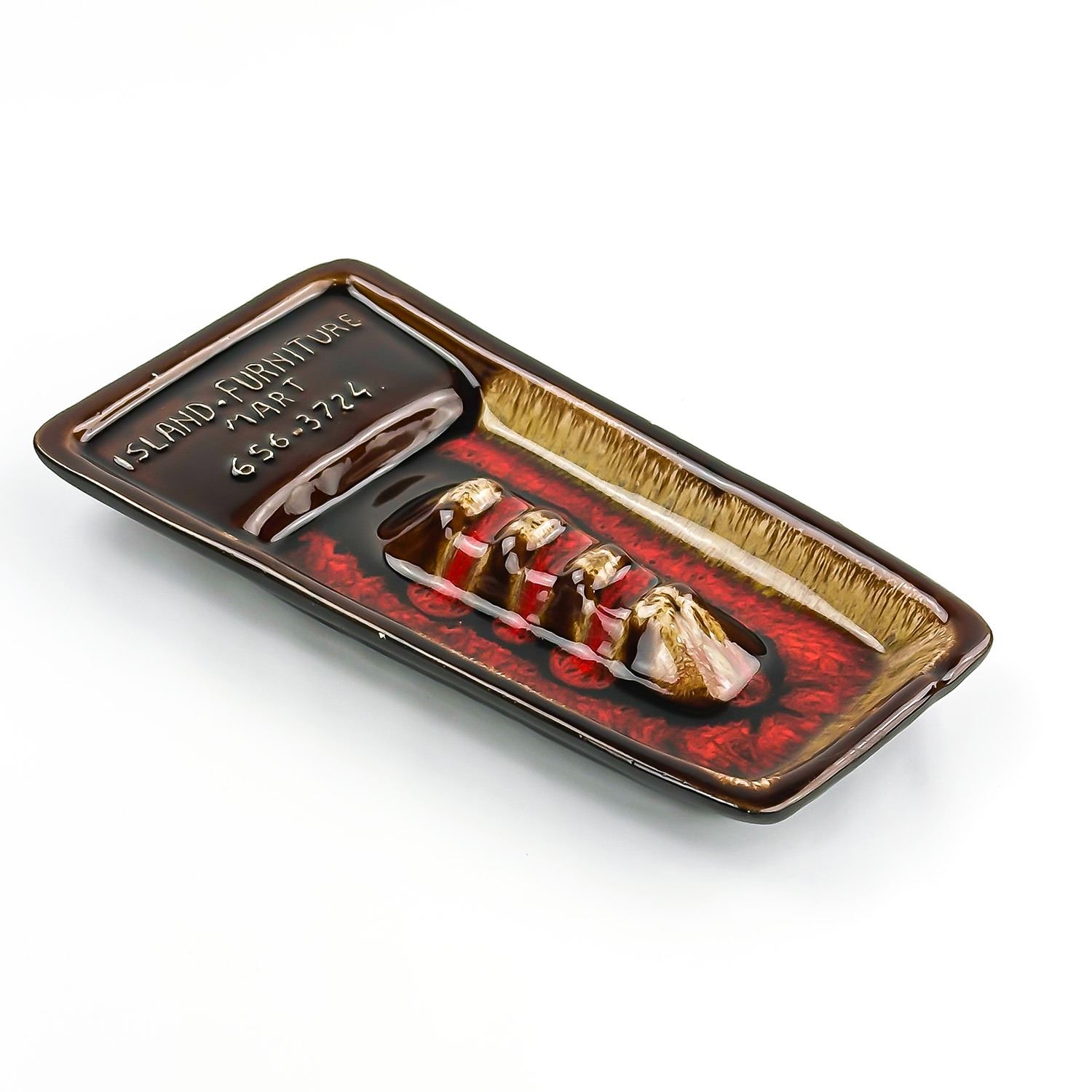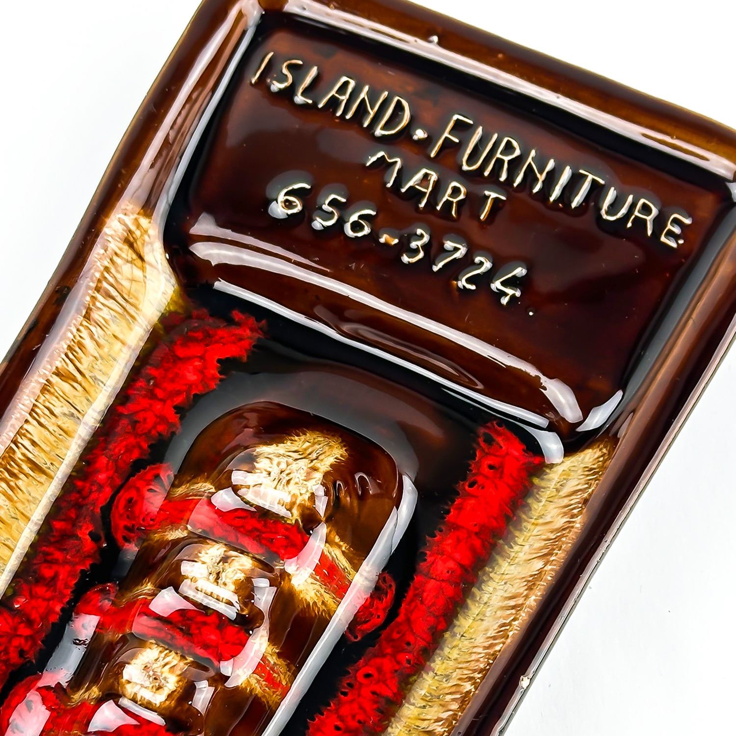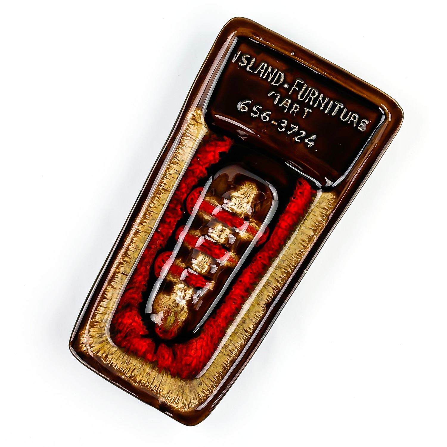 #8125 - VINTAGE ADVERTISING ASHTRAY - ISLAND FURNITURE MART - SIDNEY B.C. BRITISH COLUMBIA, CANADA. MIXED COLOR GLAZED CERAMIC / POTTERY ASHTRAY SCULPTURE. BAR OR HOME DECOR. MEASURES: 9.75” (25 CM) LONG BY 5.125” (13 CM) AT WIDEST WIDTH