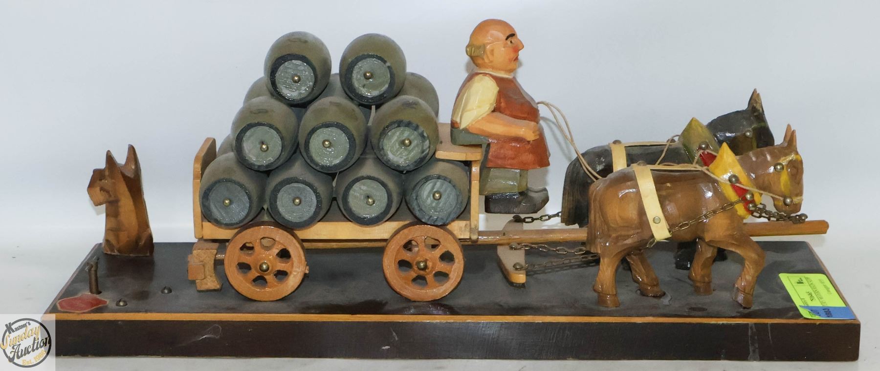 QUALITATSMARKE HANDMADE IN GERMANY WORKING WIND-UP MUSIC PLAYING HORSE DRAWN WAGON WITH BARRELS + SCOTTIE DOG **ALL ITEMS MUST BE REMOVED BY 5PM SATURDAY, JUNE 28th 2025. ALL REMAINING ITEMS WILL BE SUBJECT TO A $6.00 PER DAY STORAGE CHARGE. ANY ITEMS REMAINING AFTER MONDAY, JULY 14TH 2025 WILL BE CONSIDERED FORFEITED. NO REFUNDS WILL BE ISSUED FOR FORFEITED ITEMS. TO SCHEDULE A PICK UP APPOINTMENT CLICK HERE