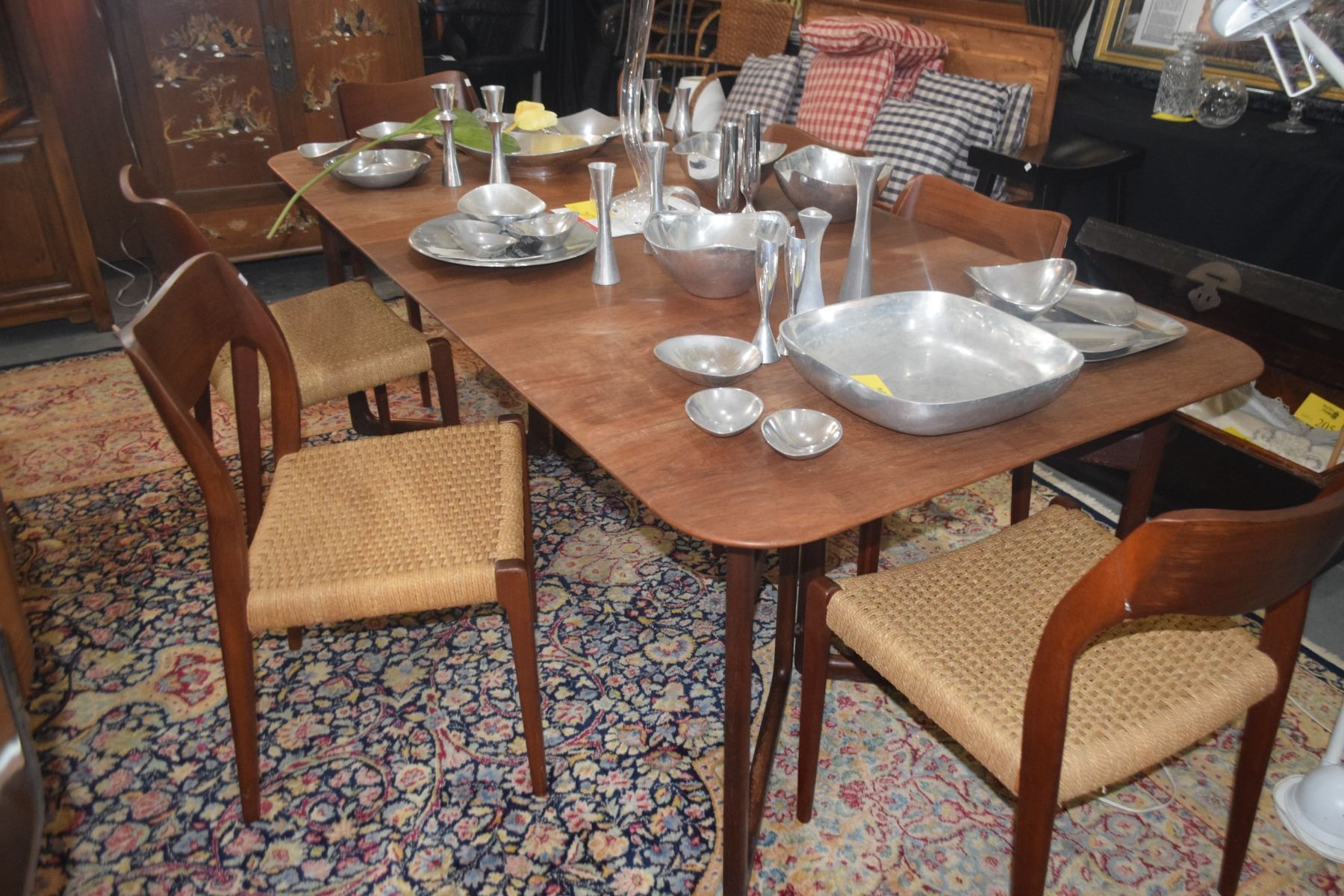 MID-CENTURY MODERN TEAK TABLE W/2 LEAVES & 6 CHAIRS