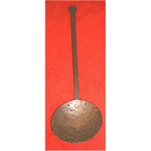 This skimmer is from mid to late 1800s. There are two brass or copper rivets holding the hand forged iron handle on to the hand tooled brass skimmer with a hanging hook turned under on the back of the handle. I believe that hook was meant to hang off a fireplace hook. This may be a PA. made piece but I am no expert on that issue. A wonderful early piece for your collection. Overall length is 18 inches and the brass skimmer is about 5 inches round.