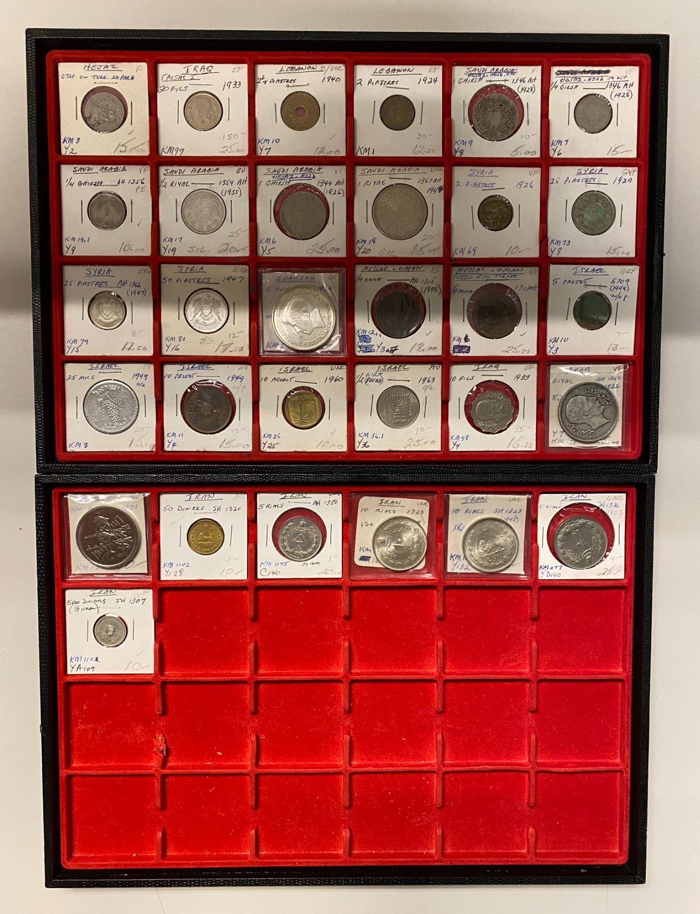 MIDDLE EAST: LOT of 31 coins, including 11 silver, 4 of which are crowns featuring a Hejaz counterstamp (KM 3), a 1932 Iraq Rial (VF), and a Sharjah 5 rupees 1964, and a high grade scarce variety Muscat AH 1313 1/4 anna; retail value $450, lot of 31 pieces.