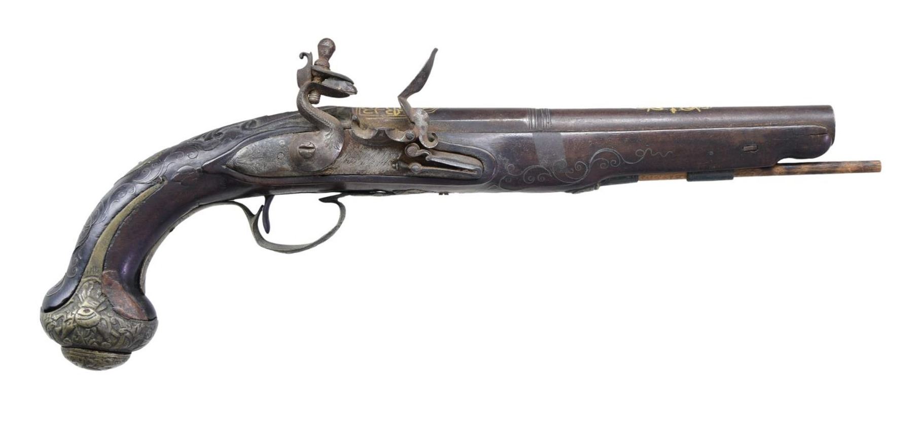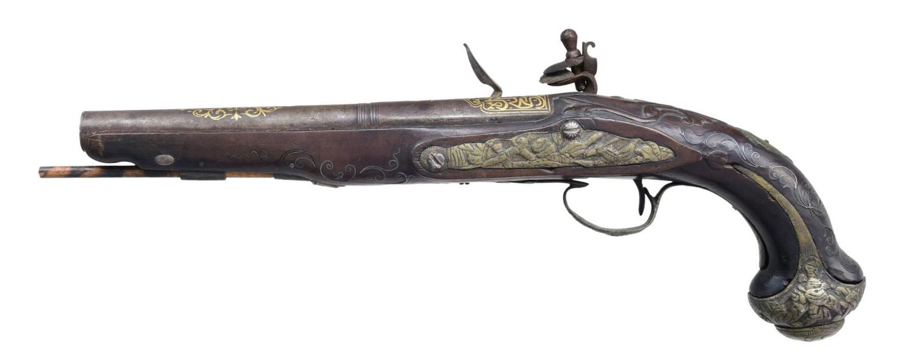 Cal. 66. NSN. Bbl. 9". Middle Eastern flintlock pistol produced by an unknown maker. Lockplate, swan neck cock, and frizzen exhibit some light foliate engraving. Top of bbl. exhibits 2 sections of ornate Middle Eastern pattern embellishments in gold. Full stock features some relief carving, with decorative wire inlays overall. Decorative brass butt, trigger guard, sideplate, escutcheon (on rear on wrist), and ramrod ferrules. Ramrod is a replacement. CONDITION: iron components exhibit a dark gray patina, with the bbl. exhibiting a mottled gray patina with scattered spots of age related discoloration. Brass components exhibit a pleasing untouched brown patina. Stock exhibits some scattered marks from handling and storage, a small crack on either side of the forend, some minor chipping (primarily around the butt), as well as a repair on the left side of the butt. Silver wire inlay remains largely intact, with some scattered losses present overall. (01-25082/MLW). ANTIQUE. $1,000-1,500.
