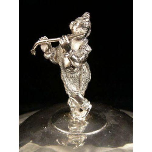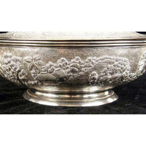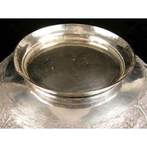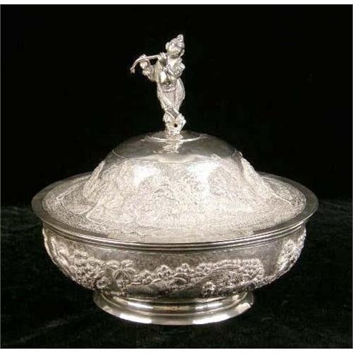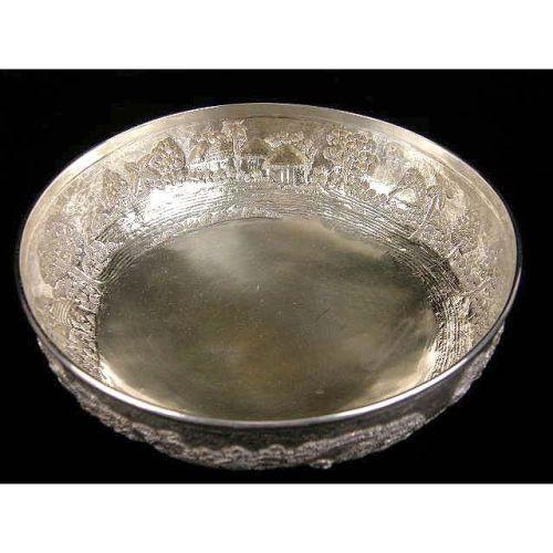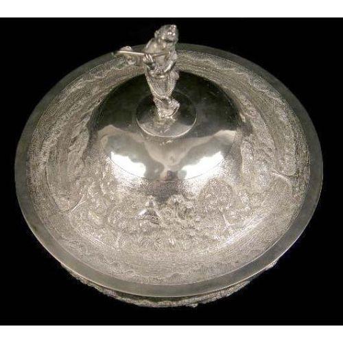 MIDDLE EASTERN SILVERED METAL COVERED CIRCULAR BOWL<BR><BR>With embosses over-all landscape scene, and figural snake charmer finial, 7-1/2"diameter