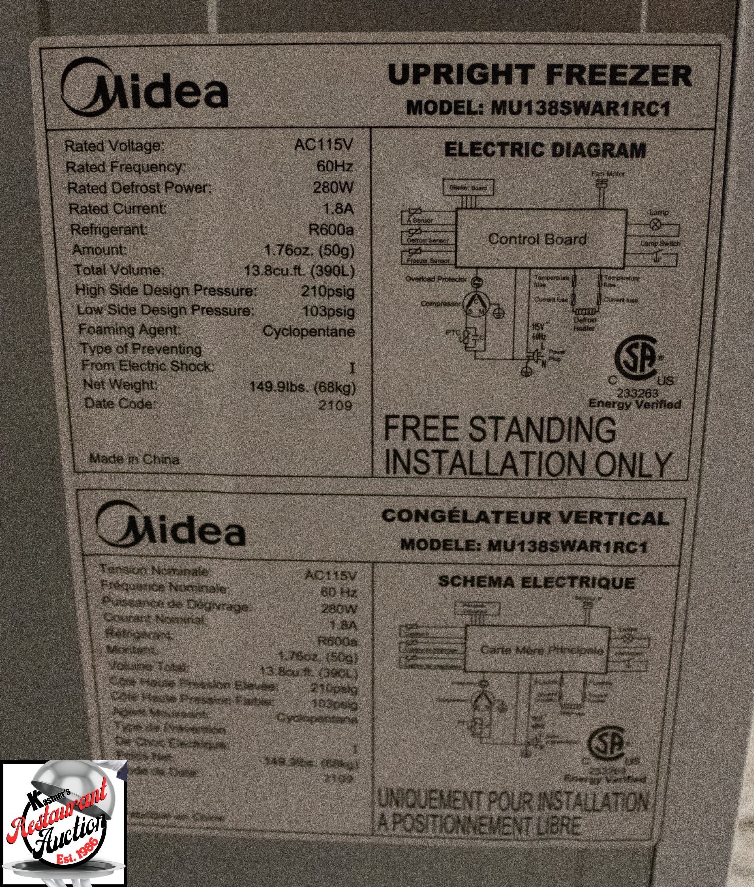 DESIGNED TO FUNCTION AS EITHER A FULL FREEZER OR A FULL REFRIGERATOR, MODEL # MU138SWAR1RC1, AC 115 VOLTS, 60 HZ, 280 WATTS, 1.8 AMPS, 28" 30" X 62"