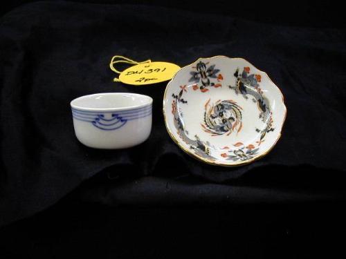 MIESSEN CROSSED SWORDS INCLUDES (1) SALT DISH BLUE LINE BANDS EXCELLENT, (1) ORIENTAL HND PTD BUTTER PAT (W/SM HAIRLINE), 2 PC