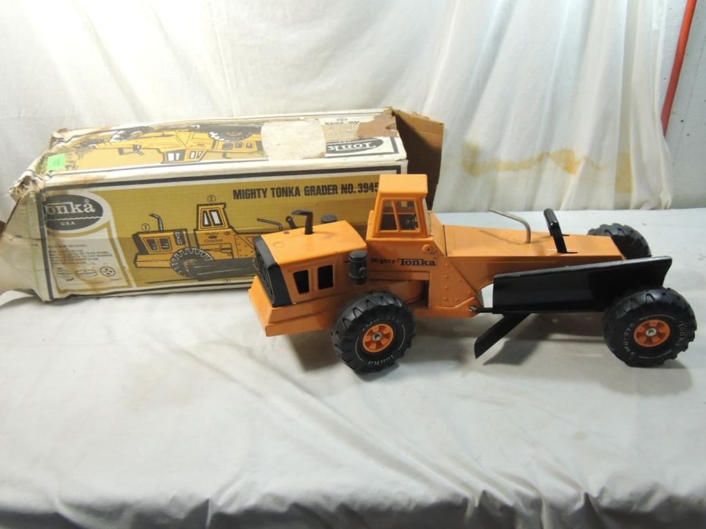 MIGHTY TONKA GRADER TONKA TRUCK, TONKA MACHINES, ORIGINAL BOX PRESSED METAL TOY CONSTRUCTION TOY, AS SHOWN SEE PHOTO FOR MORE DETAILS.