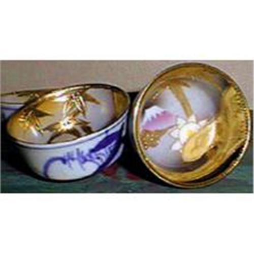 With all of the exceptional qualities of Satsuma pieces, these red marked Made in Japan Flow Blue, hand painted and heavily gilt Saki cups are equally matched in beauty and superb artistry. Then again, they may very well be used for salts if you should so desire. Whichever use you decide, they surely will exhibit a lavish and elegant display.<BR><BR>Oriental strokes of flowing blue on white porcelain represent a waterside village scene and surround the outside of the bowl. The interior artwork is to die for. Brushed colors of blue, gray and mauve are used to depict the majesty of snow capped Mt. Fugi. Elaborate heavy high relief and beaded gold highlight the Rising Sun, Bamboo and Cloud. Extreme detailing goes into a framed geometric section of the interior wall of golden yellow with intricate gilt brushstroke pattern. Interior rim is lined with gold beading.<BR><BR>Set of five (5) measuring 2 inches round by 1 1/8 inch high on a squat pedestal base. All are in impeccable condition and will not disappoint any lover of this style fine hand painted porcelain.<BR><BR>