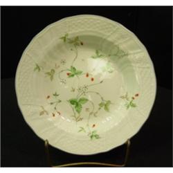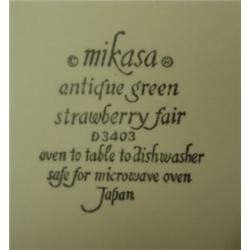 Mikasa Antique Green Strawberry Fair dinnerware. Japan. Service for 4 - 26 pieces. Each place setting includes dinner plate, luncheon plate, crescent salad, cereal bowl, cup and saucer. Serving pieces includes two 9.25" serving bowls. Condition: Two crescent bowls have a few tiny edge chips, otherwise all are very good.