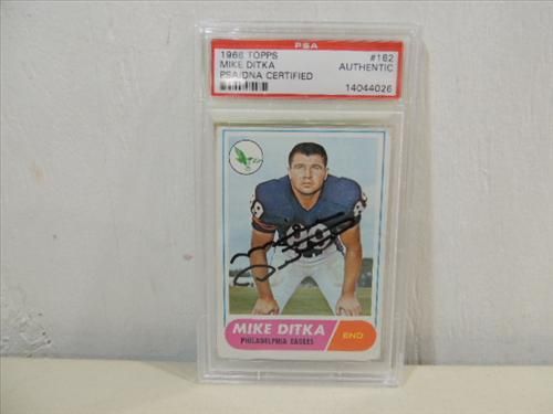 MIKE DITKA 1968 TOPPS #162 FOOTBALL CARD AUTOGRAPHED COA. PSA / DNA CERTIFIED AUTHENTIC. AS SHOWN. VIEW PICTURE FOR DETAIL. PLEASE BE ADVISED, AND INFORMED REGARDING SIGNATURES OR AUTOGRAPHS THAT WE SELL AT AUCTION: WE ARE NOT AUTHENTICATORS, AND WE DO NOT AUTHENTICATE, OR VALIDATE ANY AUTOGRAPHS OR SIGNATURES THAT WE OFFER AT AUCTION. SOME AUTOGRAPHS OR SIGNATURES MAY COME WITH AN AUTHENTICATION FROM ANY ONE OF LITERALLY HUNDREDS OF AUTHENTICATORS ACROSS THE COUNTRY, AND AROUND THE WORLD. WE DO NOT ENDORSE ANY AUTHENTICATOR, NOR DO WE GUARANTEE THAT ANY AUTOGRAPH OR SIGNATURE IS AUTHENTIC, OR THAT IT WILL PASS AUTHENTICATION BY ANY AUTHENTICATOR. ALL AUTOGRAPHS OR SIGNATURES ARE SOLD