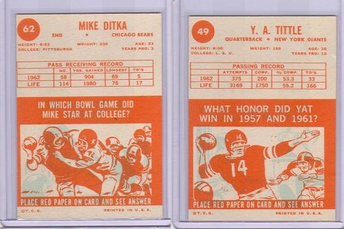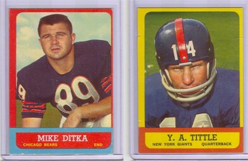 MIKE DITKA & Y.A. TITLE FOOTBALL CARDS. Consists of one Mike Ditka 1963 Topps football card. #62. Ungraded. Also consists of one Y.A. Title 1963 Topps football card. #49. Ungraded.