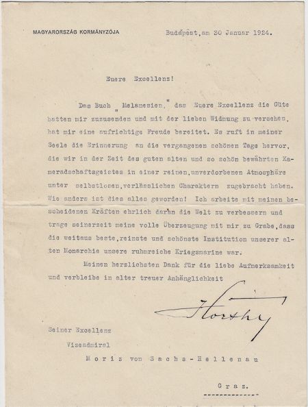 (1868 - 1957) Hungarian politician who fought Hungary's post-World War I Communist regime, overthrowing it only to be abducted by the Nazis and forced into exile. T.L.S. on official Regent of Hungary letterhead, 1p. 4to, Budapest, Jan. 30, 1924 to Vice Admiral Moritz von Sachs-Hellenau (1844-1933) in Graz. Largely untranslated but undoubtedly referring to the book "Melanesien" sent to Horthy as a gift and upon which Horthy no doubt comments favorably. Near fine, with transmittal envelope.