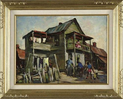 MILDRED C JONES (American, 1899-1992) HOUSE WITH FAMILY. Oil on board scene shows a five member black family outside a two-story house with balcony. A figure with pink dress sits in balcony and colorful clothes hand on two clotheslines. Signed lower right. Housed in a modern carved gold wood frame. Scene could be Jamaican or Caribbean. SIZE: 12" x 16". CONDITION: Very good with some inpainting in the sky. 9-27320