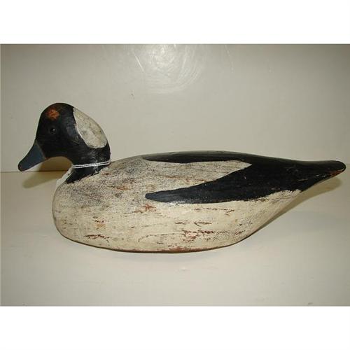 MILES HANCOCK, CHINCOTEAGUE, VIRGINIA, BUFFLEHEAD DECOY. Tack eyes. Shows wear and some loss to paint. 12.5” L