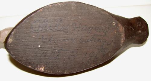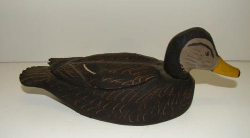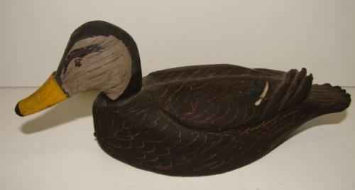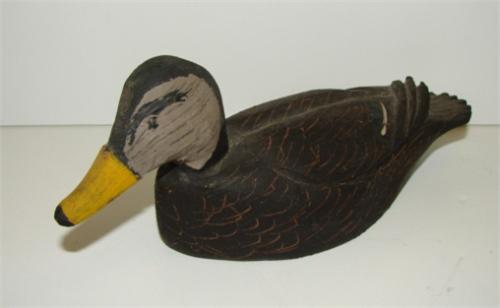 MILES HANCOCK, CHINCOTEAGUE, VIRGINIA, MINIATURE BLACK DUCK DECOY. Signed on bottom "Miles Hancock/Chincoteague/Oct. 8, 1967". 6.75" L