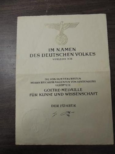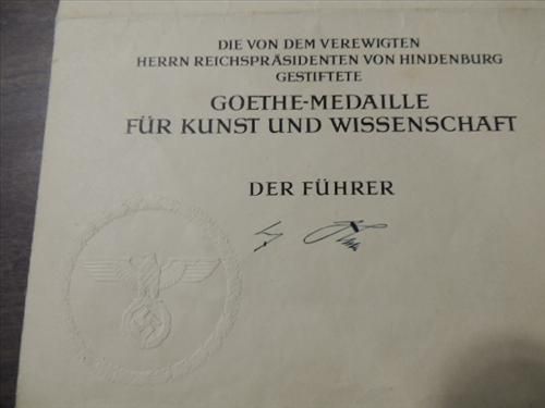 MILITARIANA: RARE SCIENCE AWARD CERTIFICATE SIGNED BY ADOLPH HITLER. NO COA. EMBOSSED NAZI EMBLEM ON DOCUMENT. 10X14. AS SHOWN. VIEW PICTURE FOR DETAIL.