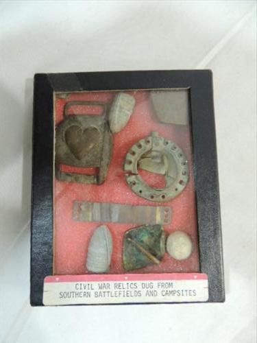 MILITARIANA CIVIL WAR BATTLE RELICS: UNION 3 RING MINNIE, SHARPS CARTRIDGE, LANTERN PART, EPAULET PART, COLONIAL BUTTON & 69 CAL BALL. AS SHOWN. VIEW PICTURE FOR DETAIL.