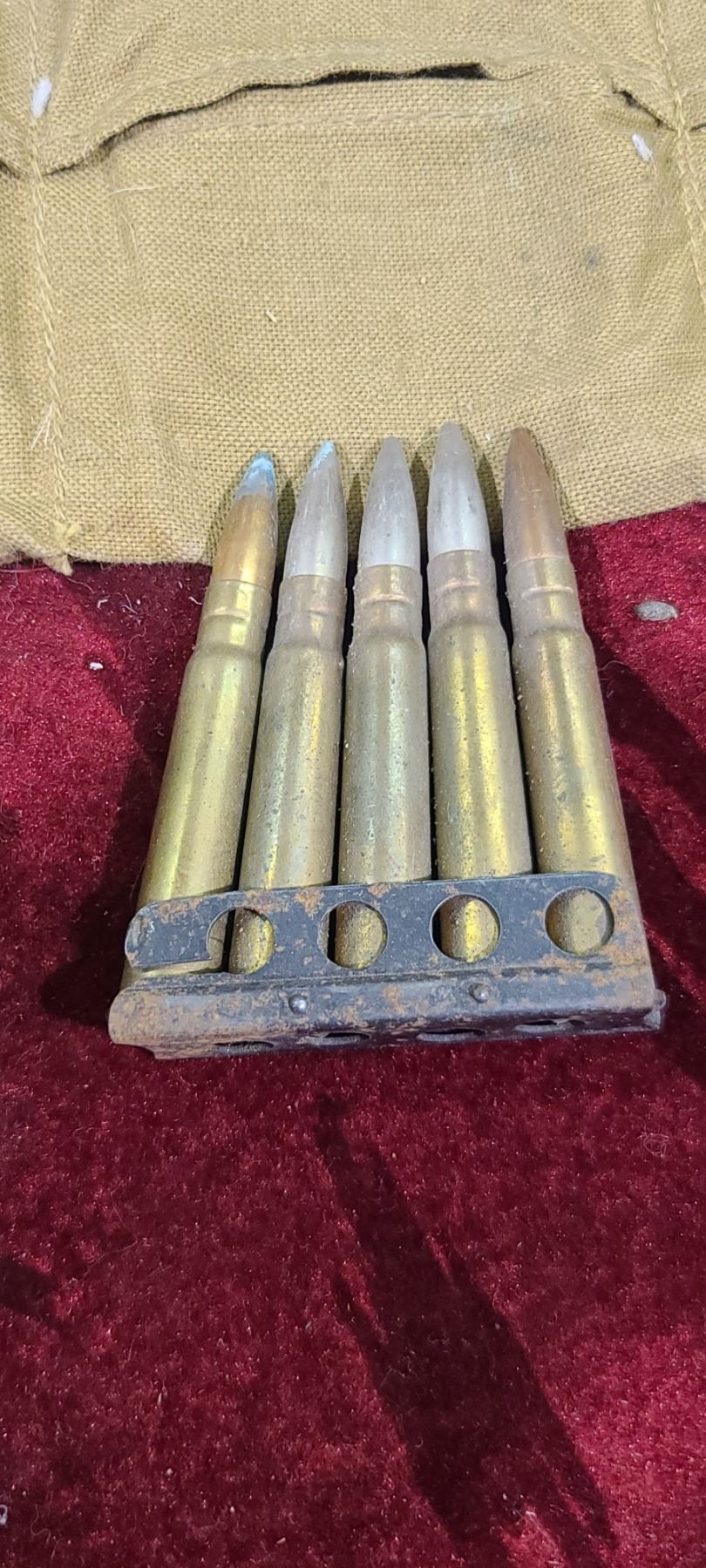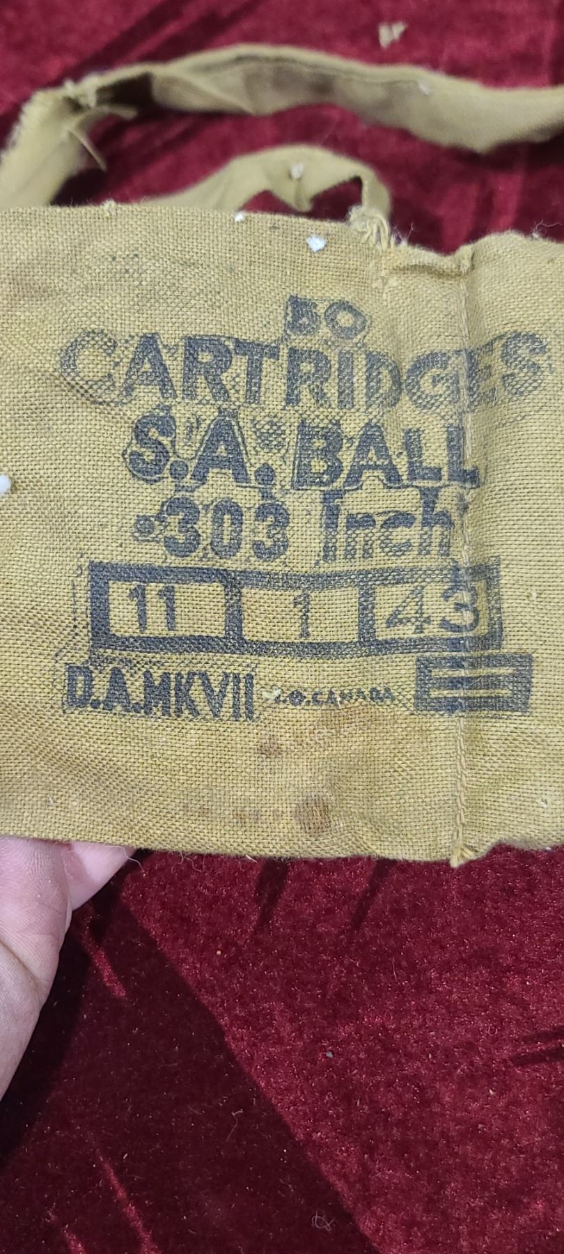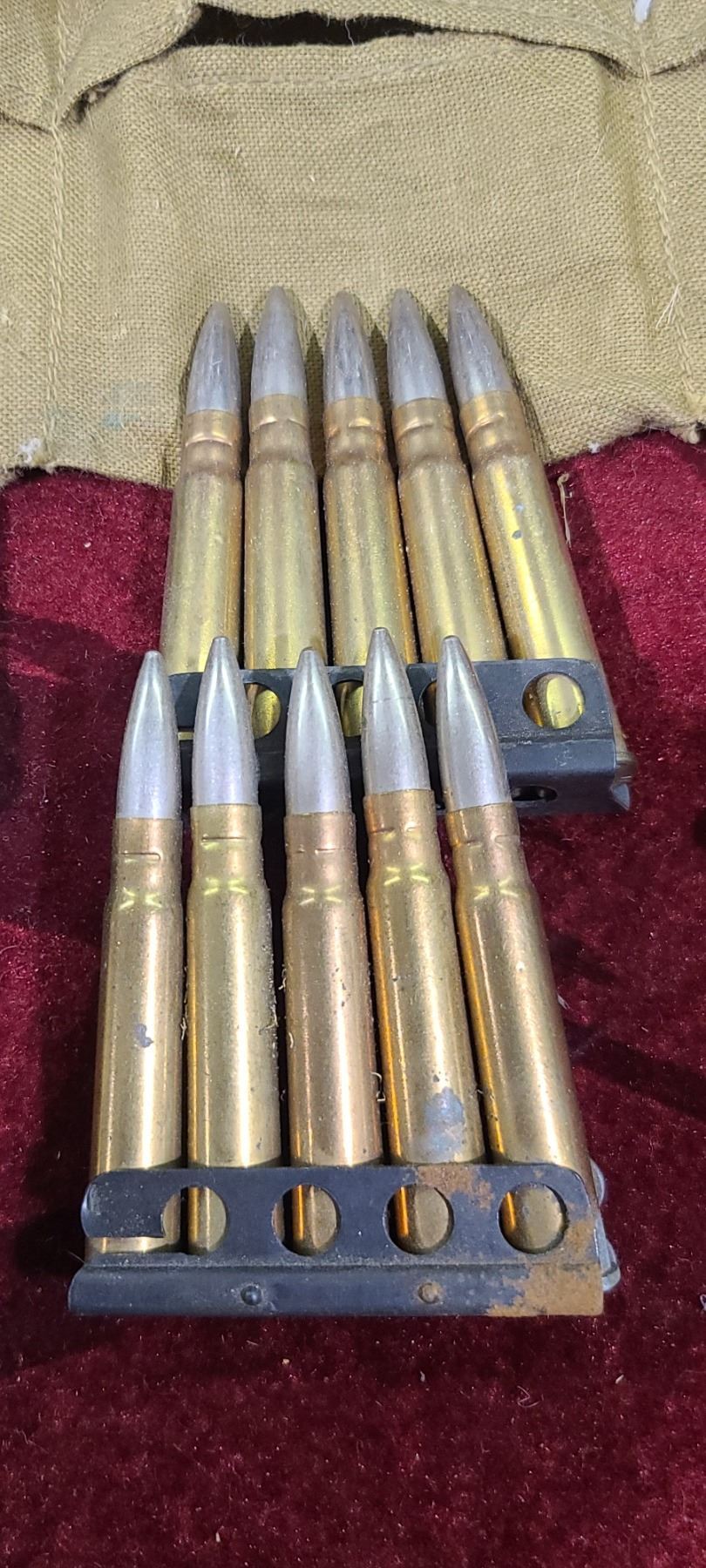 MILITARY AMMO POUCH WITH EIGHT FUL .303 BRITISH CLIPS - 45 ROUNDS OF S.A. BALL - POUCH MARKED AS 11/1/43