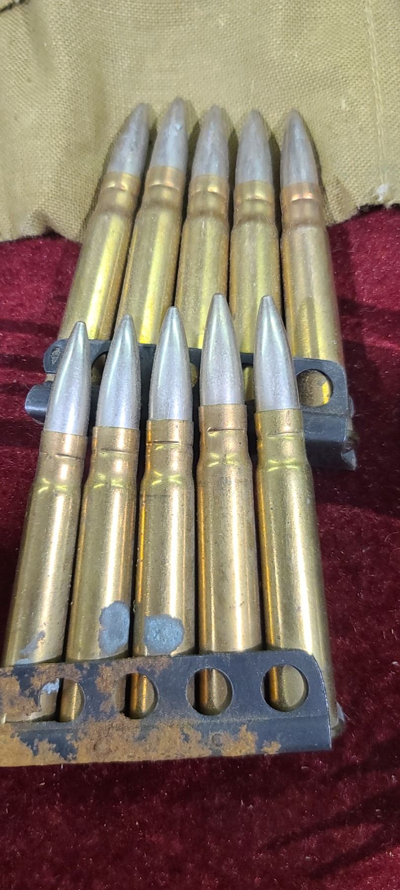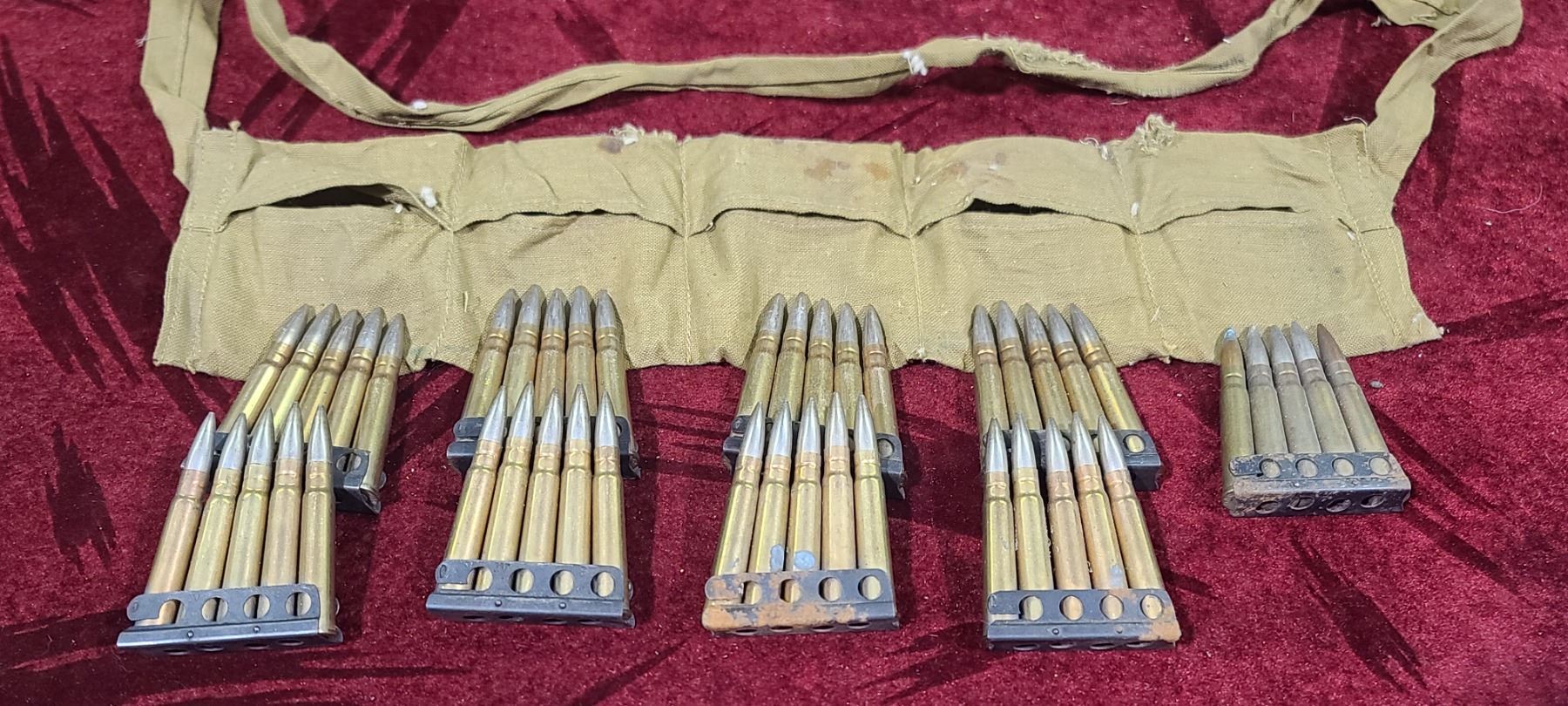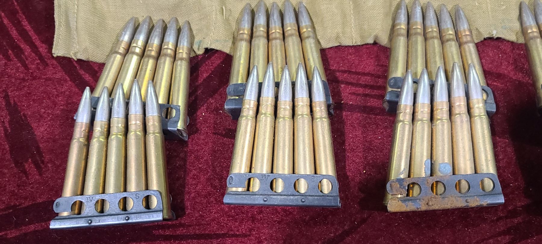 MILITARY AMMO POUCH WITH EIGHT FUL .303 BRITISH CLIPS - 45 ROUNDS OF S.A. BALL - POUCH MARKED AS 11/1/43