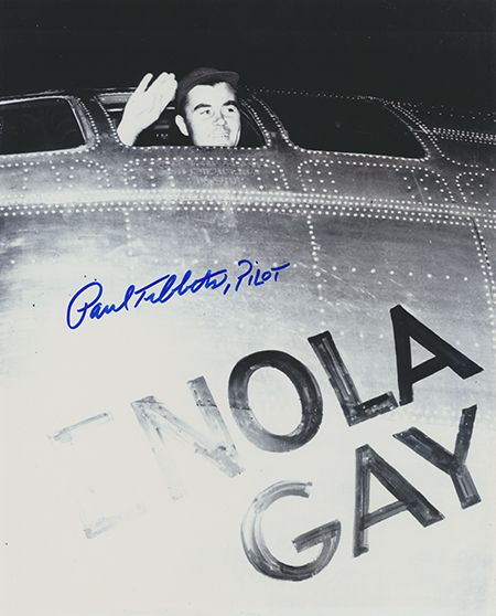 Lot of two signed photos, each 8" x 10" b/w includes PAUL TIBBETS waving from his seat aboard the Enola Gay, with CHUCK YEAGER standing beside his aircraft, an F-20 Tigershark. Tibbets' photo is mounted, else fine.