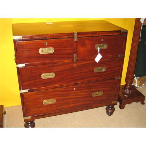 AN EXTREMELY HANDSOME ENGLISH MAHOGANY MILITARY CHEST, WITH TWO LARGE DRAWERS AND TWO SMALL DRAWERS AND INLAID BRASS NAME PLATE ON THE TOP WHICH IS UN -ENGRAVED. IT HAS BRASS SIDE CARRYING HANDLES AND BRASS MOUNTED CORNERS AND THE TYPICAL FLAT BRASS MILITARY TYPE DRAWER PULLS. THE SMALL SIZE IS VERY DESIRABLE AND IT HAS GREAT COLOR AND PATINA.