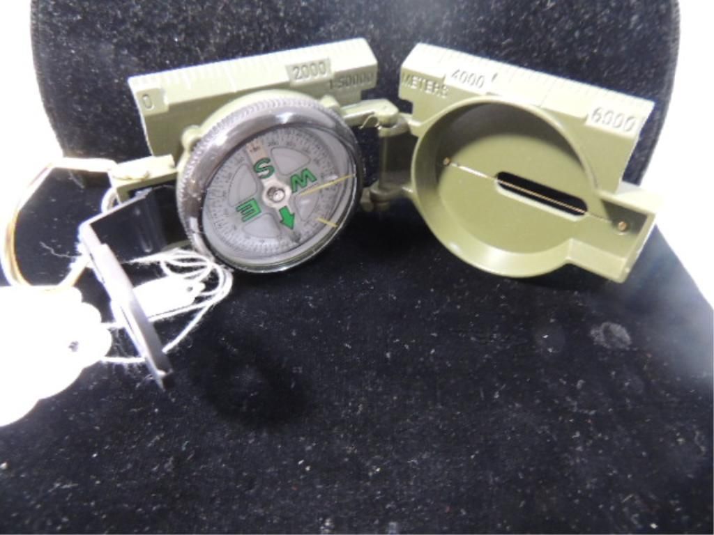 MILITARY COMPASS LIQUID FILLED. OLIVE ALUMINUM CASE MAGNIFYING GLASS. SIDE RULER. AS SHOWN. SEE PHOTO FOR MORE DETAILS.
